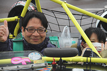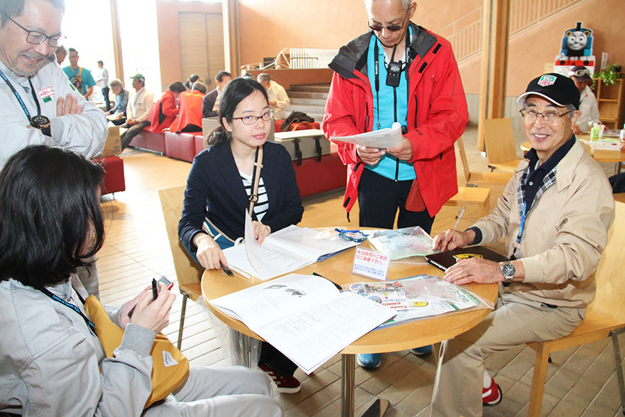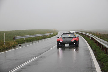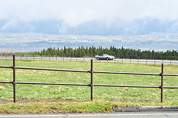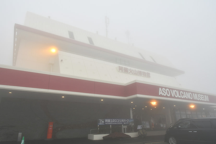 チェックポイントは阿蘇山の火山活動や気候を考慮して、当初の予定だった阿蘇中岳火口から少し手前の草千里の駐車場にある火山博物館に変更されました。道の駅「阿蘇」の前から登山道に駆け上っていく頃には、晴れ間も見えて、草千里に近づくころには街を見下ろすこともできました。草千里周辺はふたたび濃い霧に覆われていましたが、火山博物館の隣のレストラン「ニュー草千里」など、お土産屋さんをのぞく参加者の姿も多く見られました。