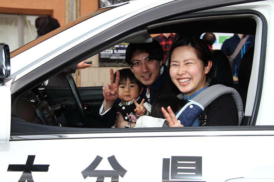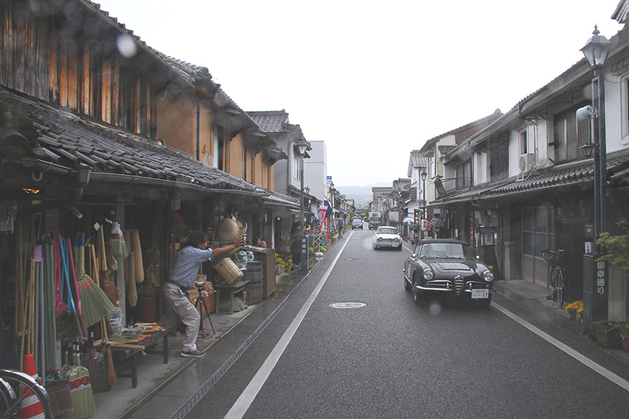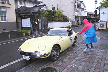 江戸時代にできた城下町である豆田町(まめだまち)は、侵入者の見通しを悪くするために道がクランクになっている古い町並みです。この時、雨が強くなってきていてスタンプを待つ車列が伸びていました。観光で訪れていた訪日外国人も買い物途中に沿道に出て、珍しそうに撮影している光景が印象的でした。