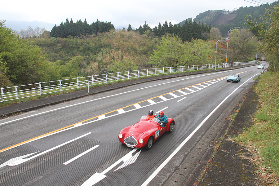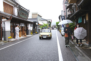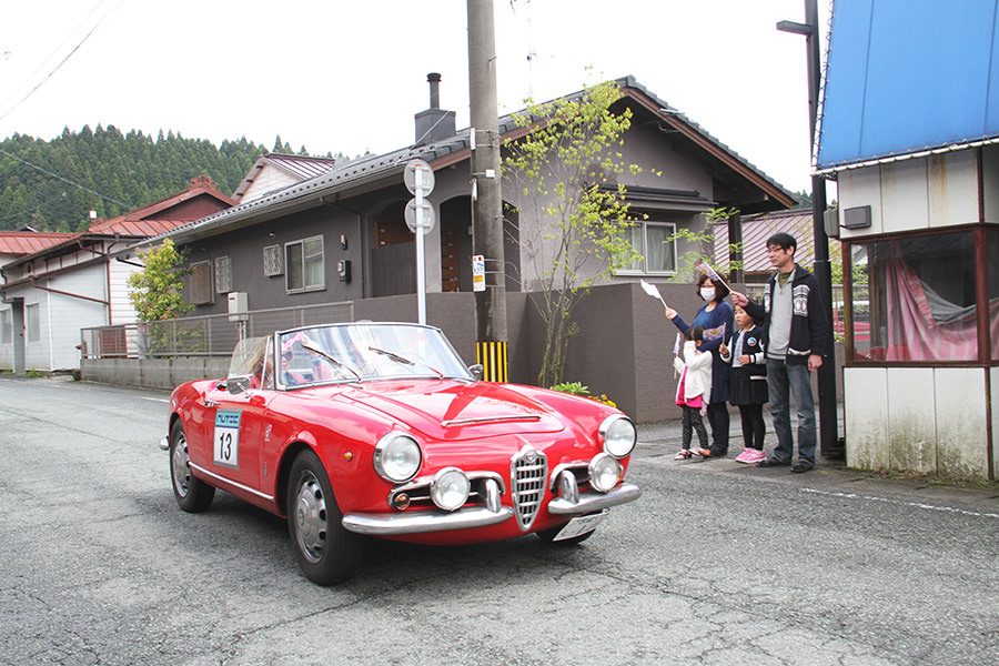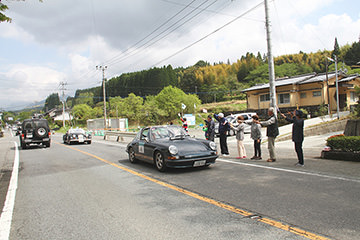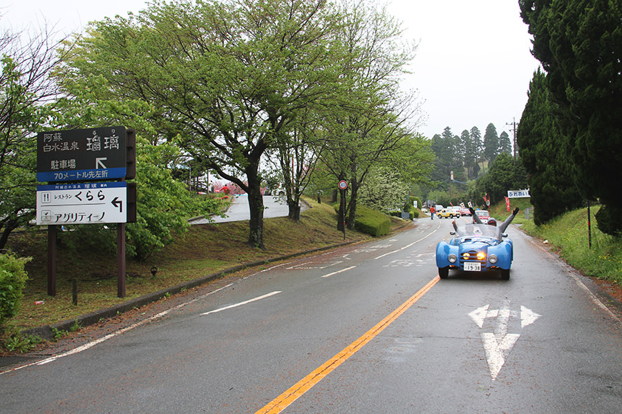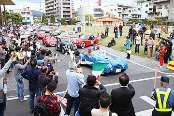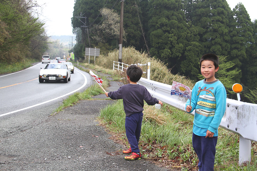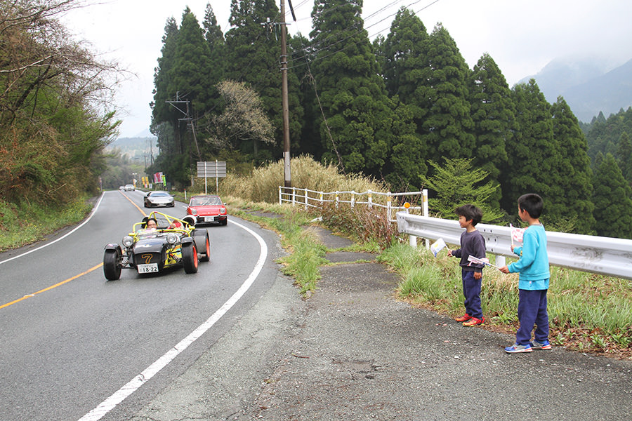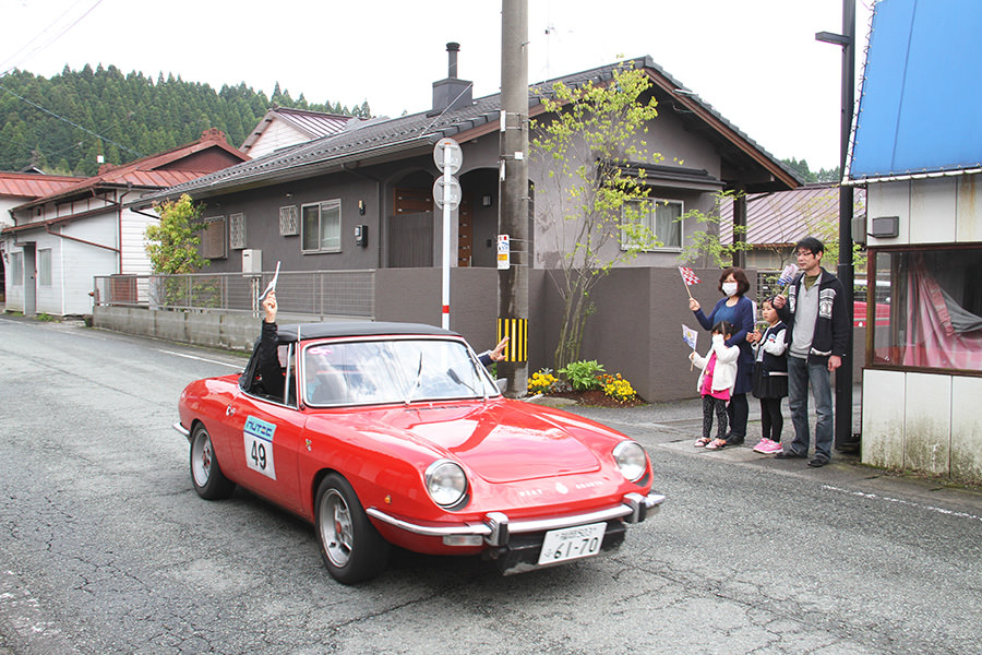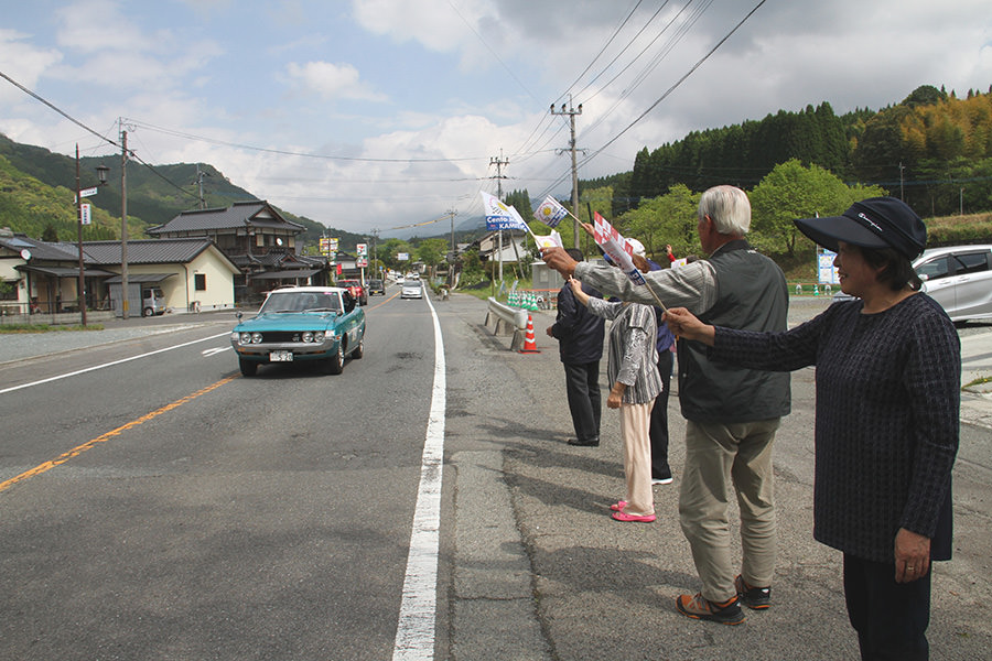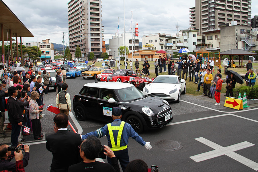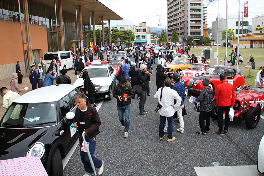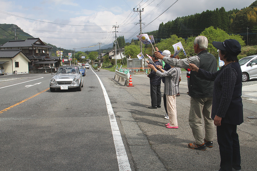 スタートは昨年同様にパトリア日田から。モダンな雰囲気の建物の前にはヒストリックカーがギッシリと並び、エントランスのみならず町民も見学に来ています。講堂で開会式が行われたあとはいよいよスタート。生産年式の古い順にゼッケンが決定するということもあり、1934年式のライレー12/4スペシャルが最初にパトリア日田から飛び出していきました。沿道には多くの市民が旗を持って応援。イベントのスタートにふさわしい送り出しとなりました。