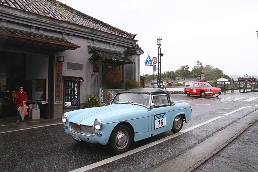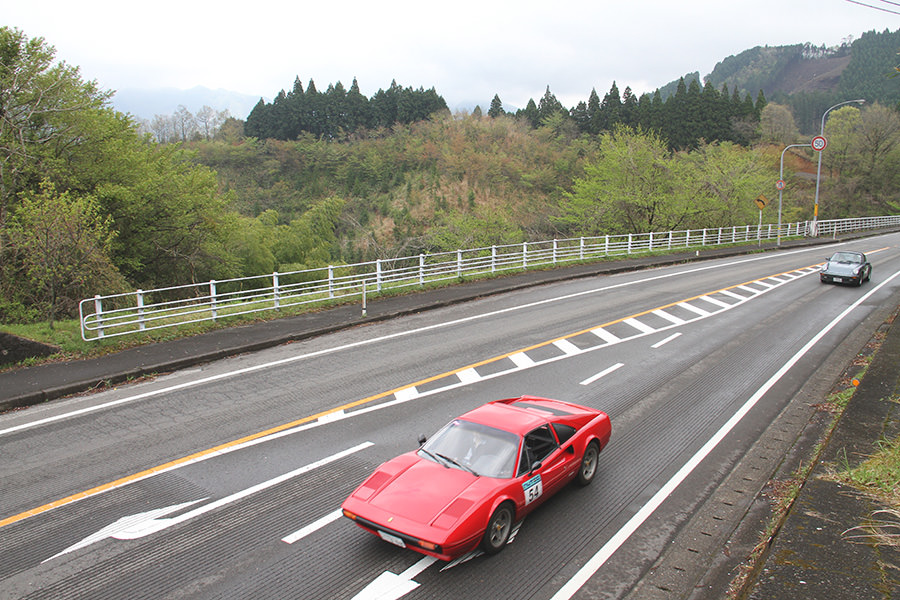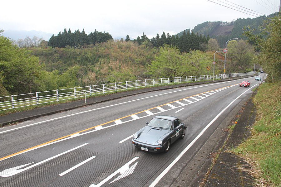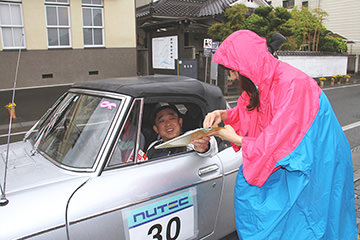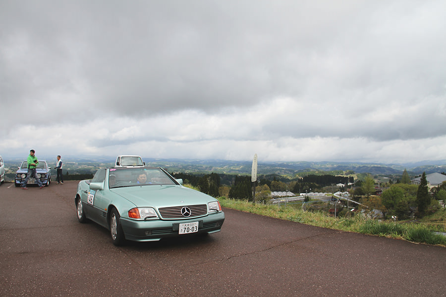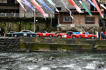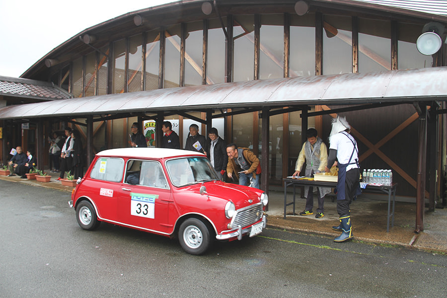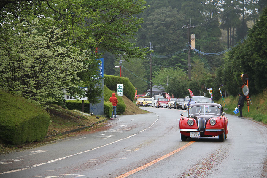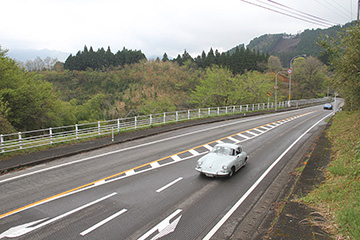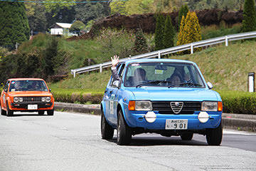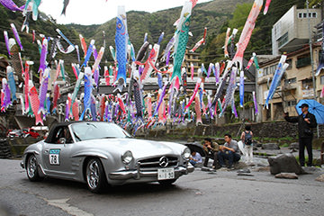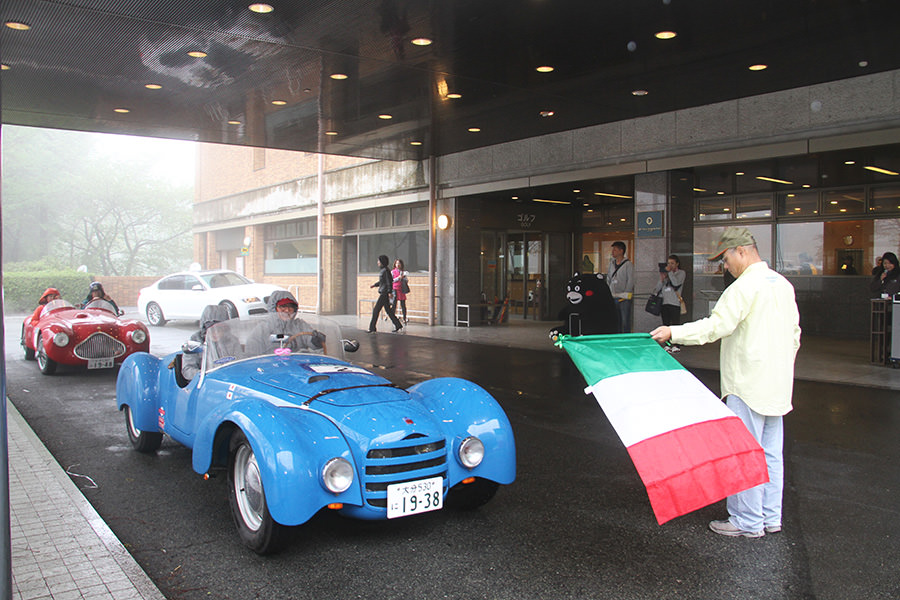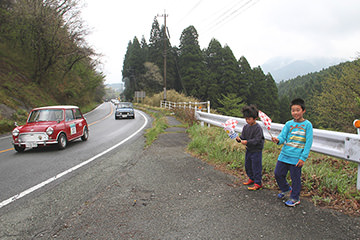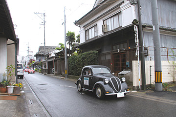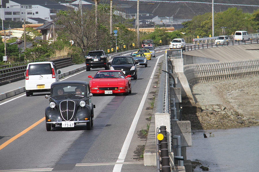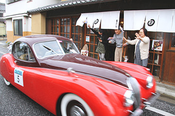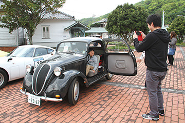 スタートは昨年同様にパトリア日田から。モダンな雰囲気の建物の前にはヒストリックカーがギッシリと並び、エントランスのみならず町民も見学に来ています。講堂で開会式が行われたあとはいよいよスタート。生産年式の古い順にゼッケンが決定するということもあり、1934年式のライレー12/4スペシャルが最初にパトリア日田から飛び出していきました。沿道には多くの市民が旗を持って応援。イベントのスタートにふさわしい送り出しとなりました。