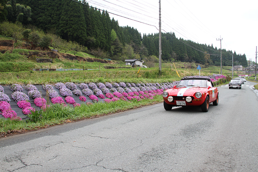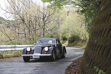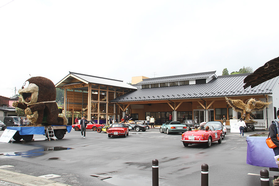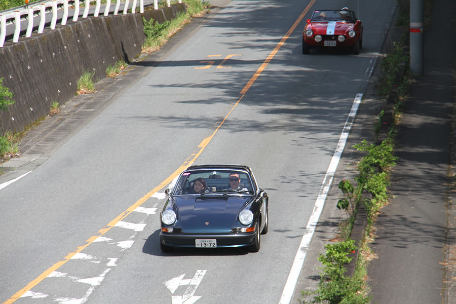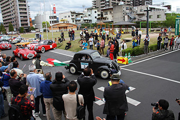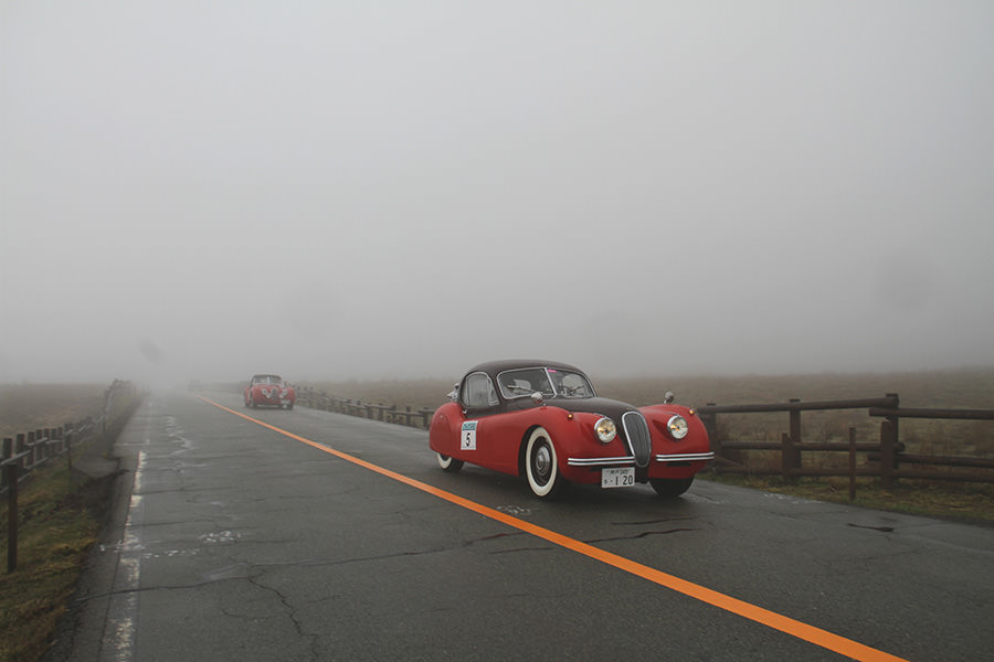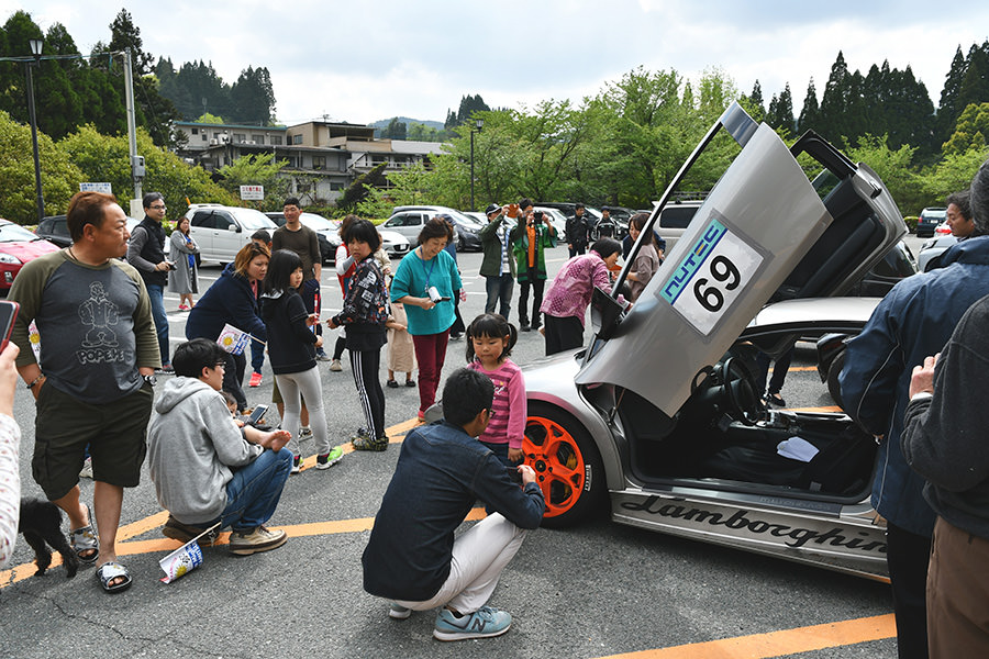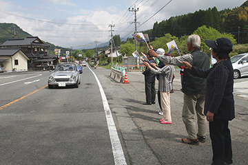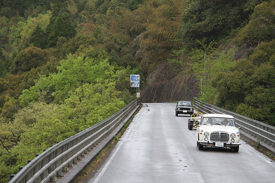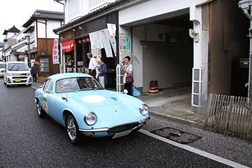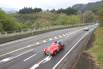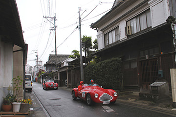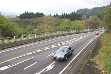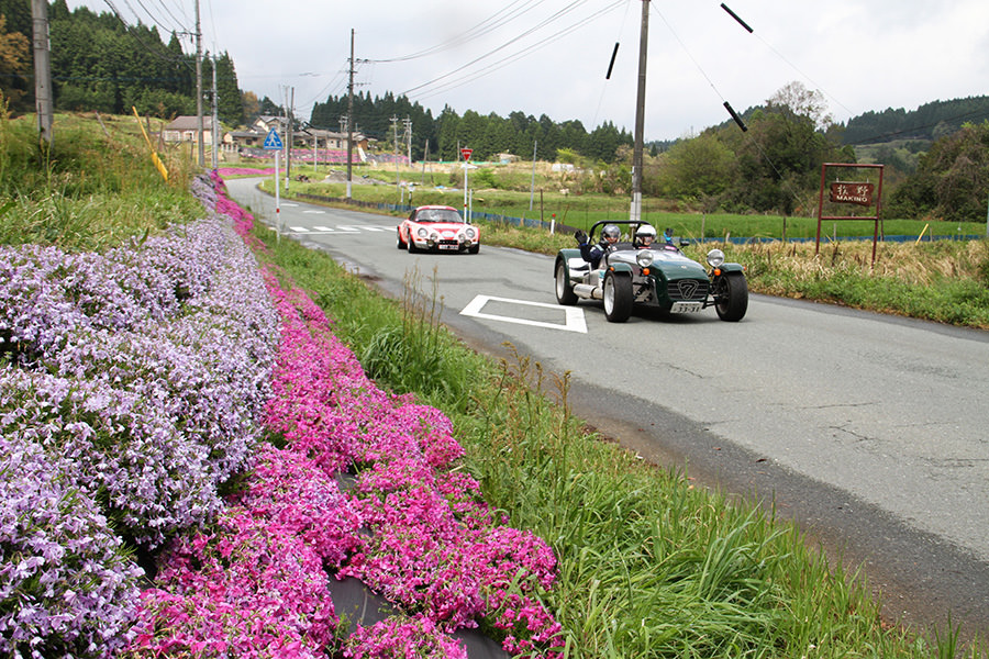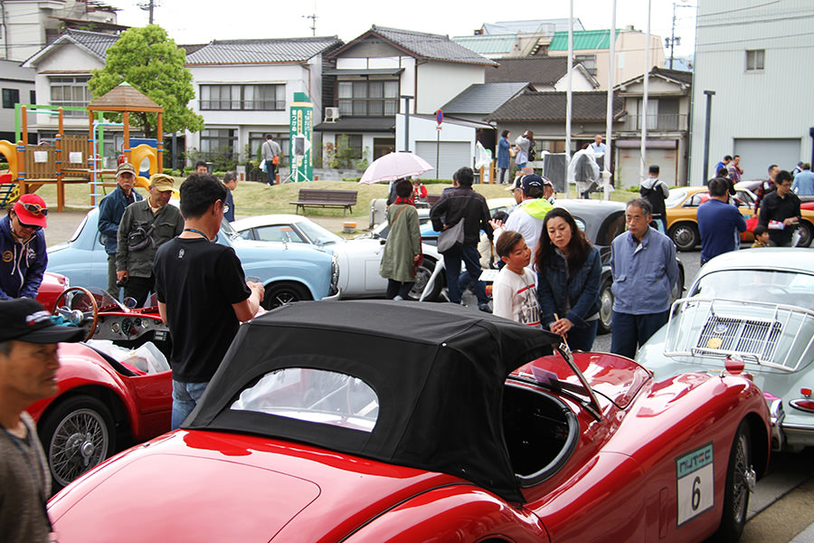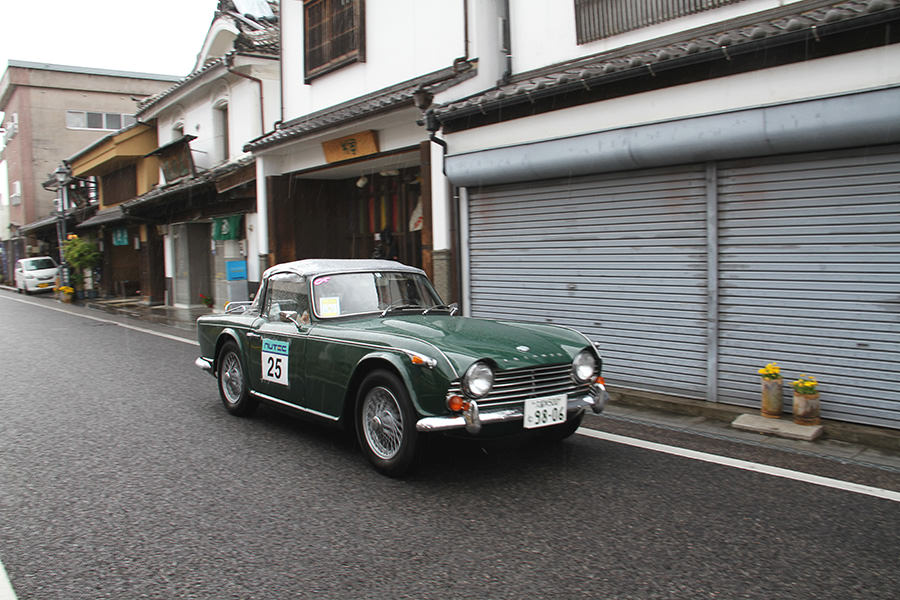 スタートは昨年同様にパトリア日田から。モダンな雰囲気の建物の前にはヒストリックカーがギッシリと並び、エントランスのみならず町民も見学に来ています。講堂で開会式が行われたあとはいよいよスタート。生産年式の古い順にゼッケンが決定するということもあり、1934年式のライレー12/4スペシャルが最初にパトリア日田から飛び出していきました。沿道には多くの市民が旗を持って応援。イベントのスタートにふさわしい送り出しとなりました。
