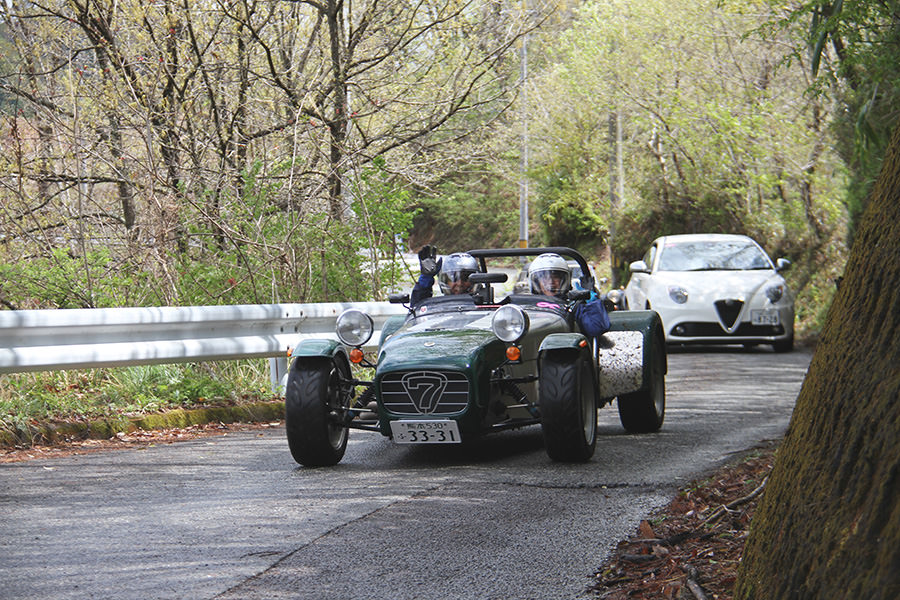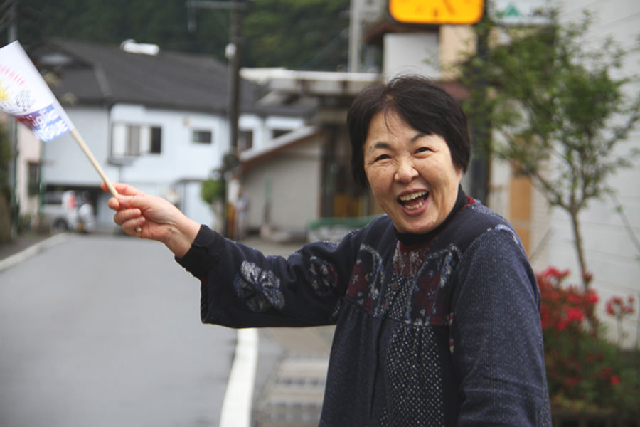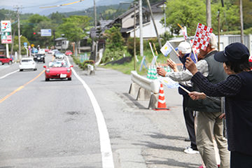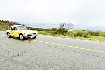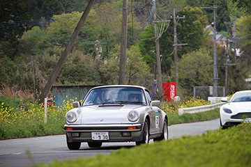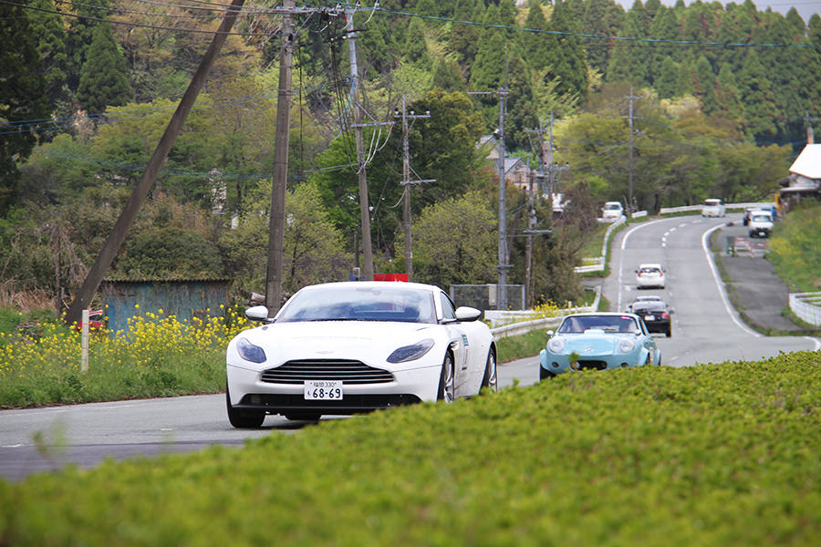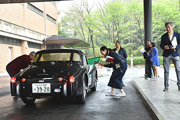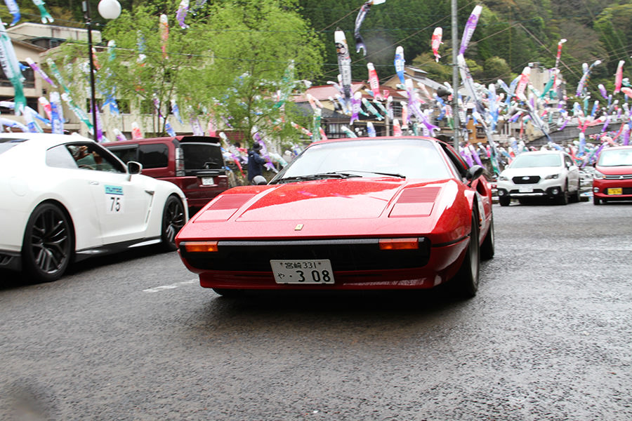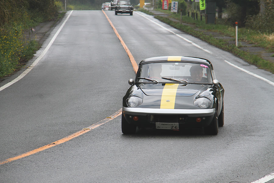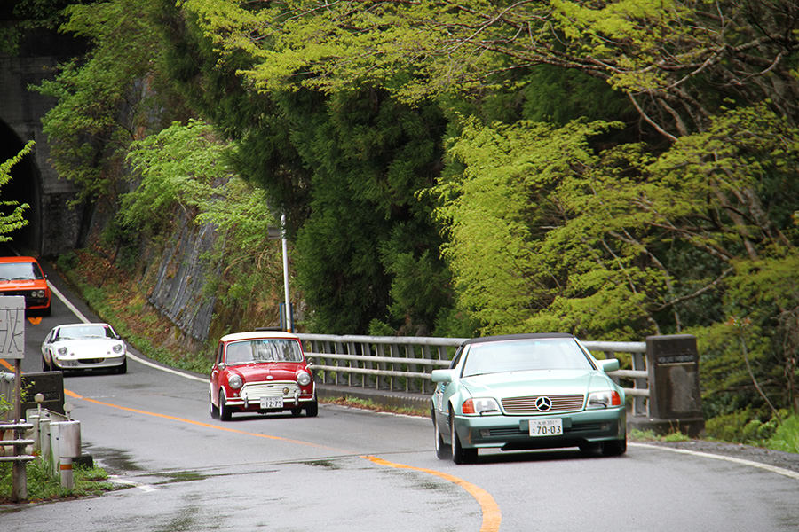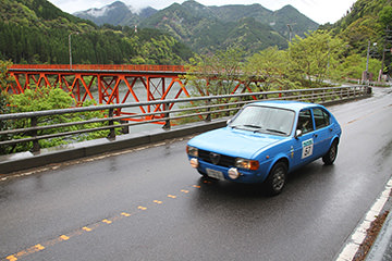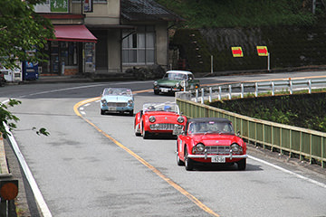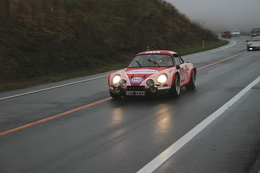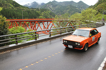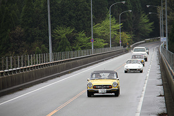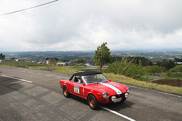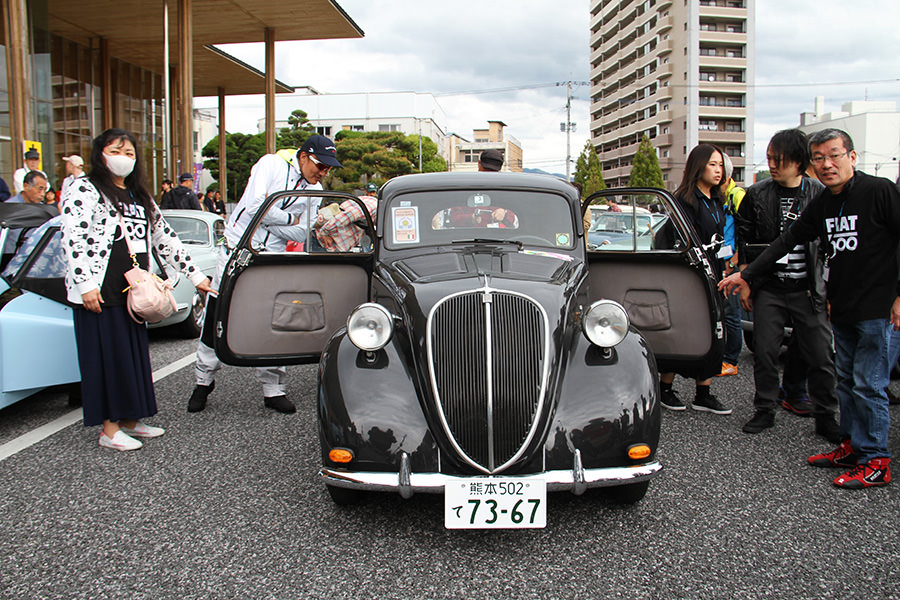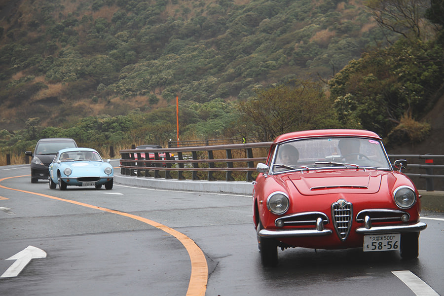 スタートは昨年同様にパトリア日田から。モダンな雰囲気の建物の前にはヒストリックカーがギッシリと並び、エントランスのみならず町民も見学に来ています。講堂で開会式が行われたあとはいよいよスタート。生産年式の古い順にゼッケンが決定するということもあり、1934年式のライレー12/4スペシャルが最初にパトリア日田から飛び出していきました。沿道には多くの市民が旗を持って応援。イベントのスタートにふさわしい送り出しとなりました。