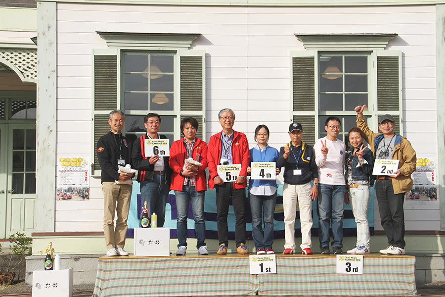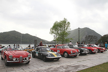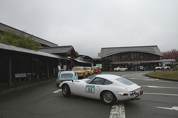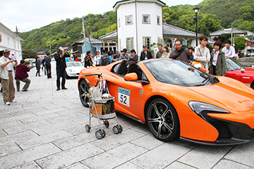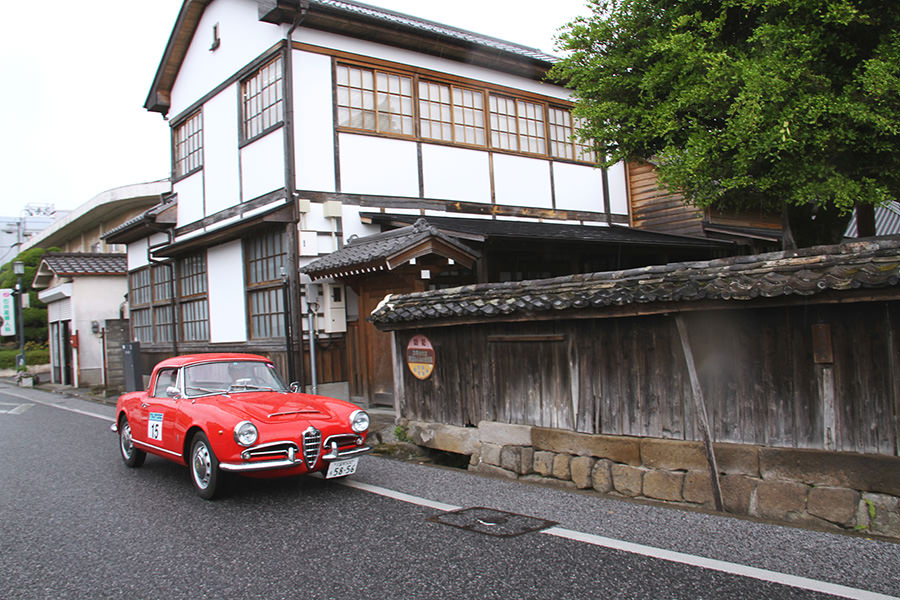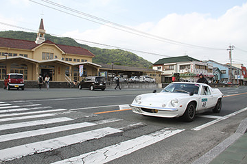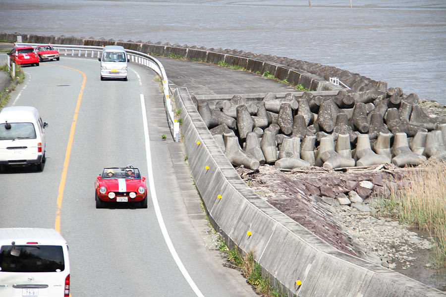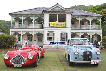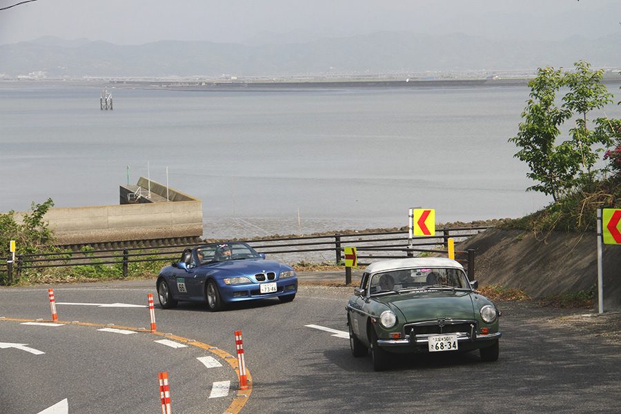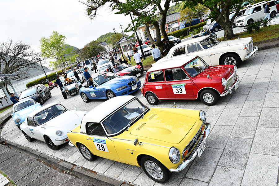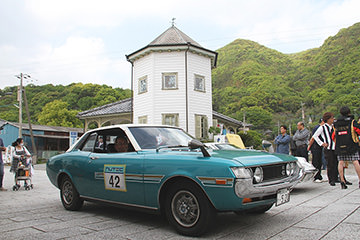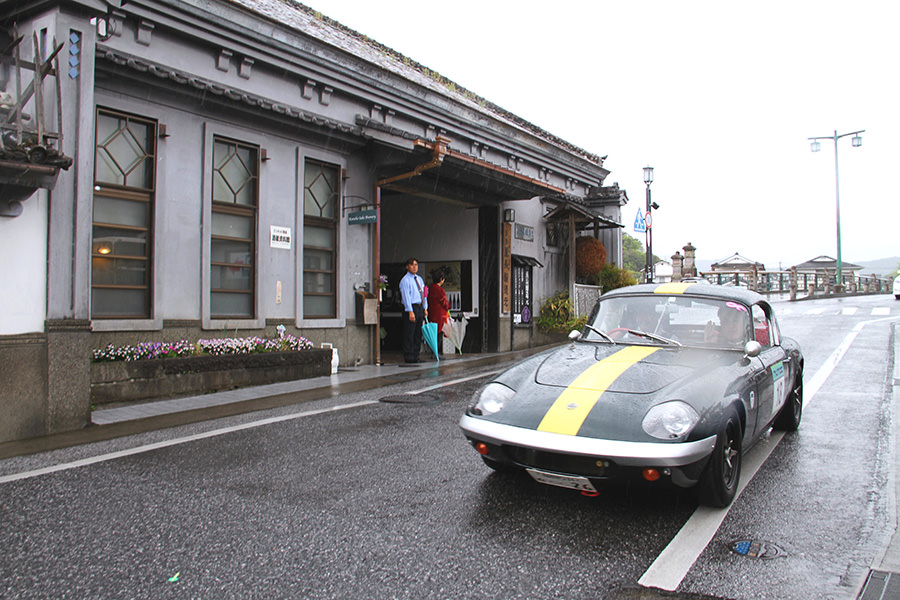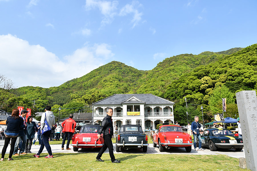 美里町から九州自動車道をまたいで宇城市方面へ。左手に穏やかな表情の八代海を望みながら海岸線を走っていくルートは、ゴール目前にして癒やしの要素満載です。そうして、とうとうたどり着いた三角西港。 明治の産業革命遺産として、海運の物流拠点として大事な役割を担った港です。当時の様子そのままにレトロな建物が敷地内に数多くあり、ゴールした参加車両が石畳に並べられると、本当にタイムスリップしたような光景でした。