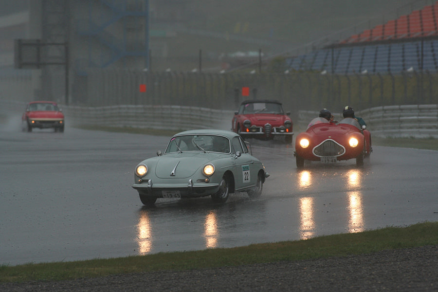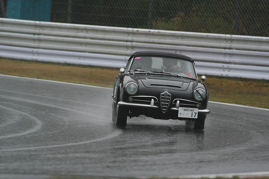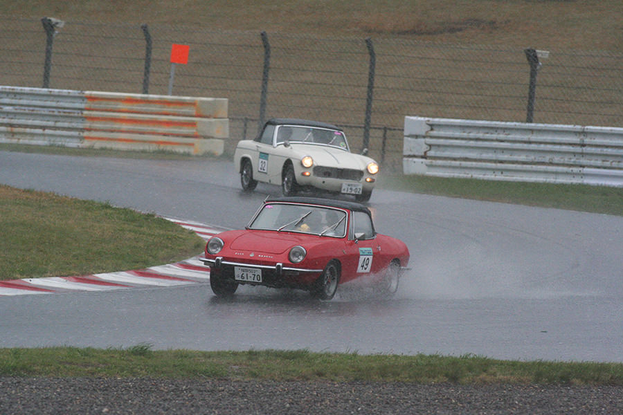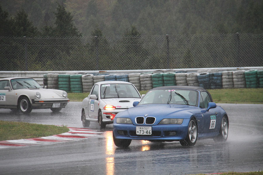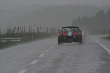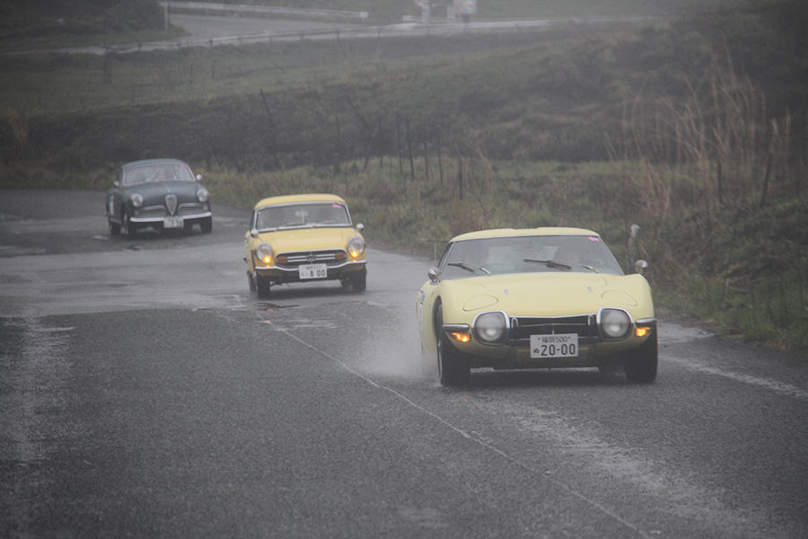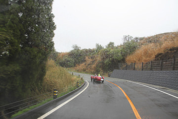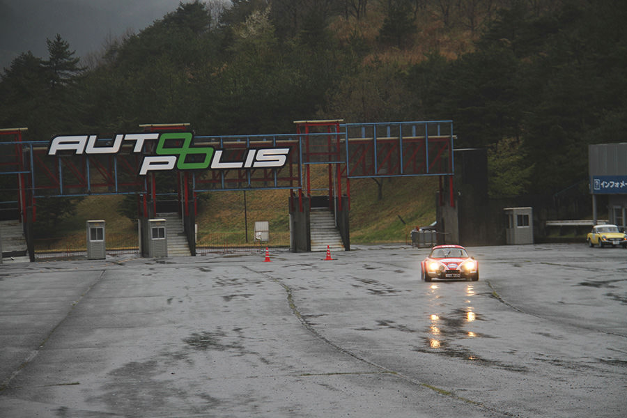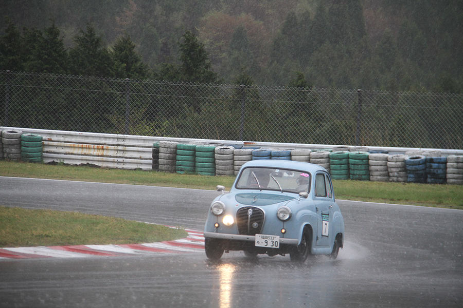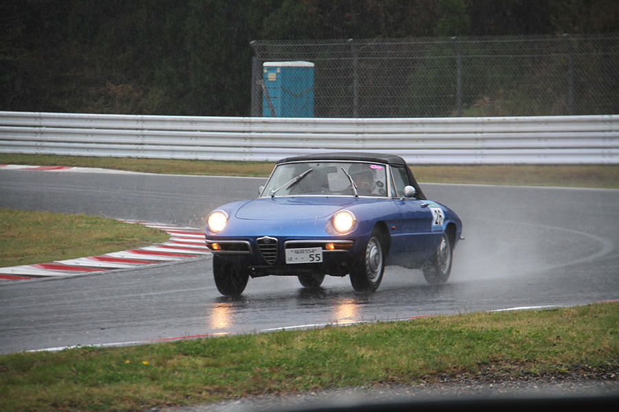 今回のスペシャルステージは上津江町のオートポリスが設定されました。F1にも対応できる国際格式サーキットをヒストリックカーが走る姿が期待されましたが……。参加者が到着するころには暴風雨状態となっており、任意で走行することとなりました。レースであれば中止となるほどの多量の雨水が流れるコースを走るのは貴重な体験。ハラハラドキドキ、皆安全最優先で走行を楽しみました。