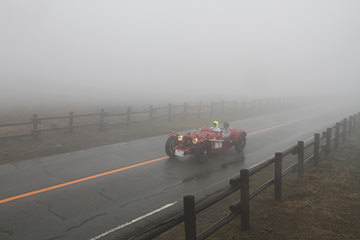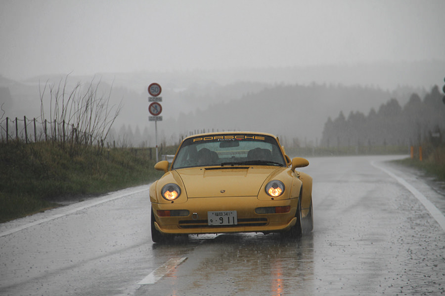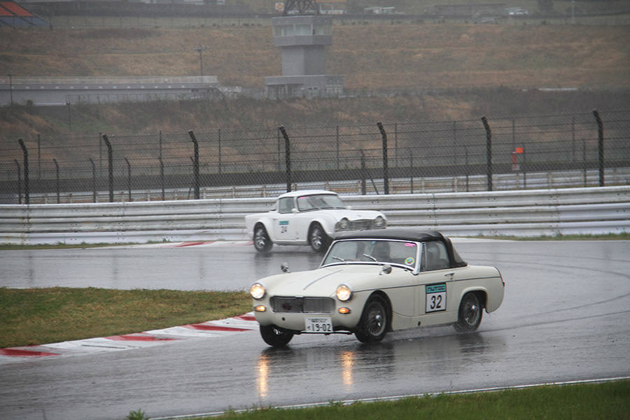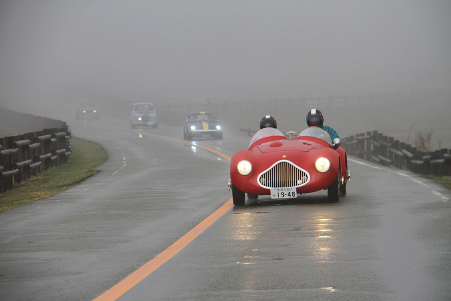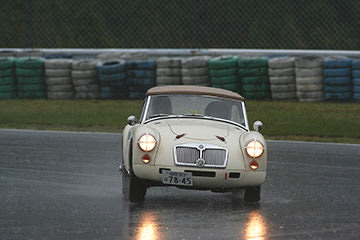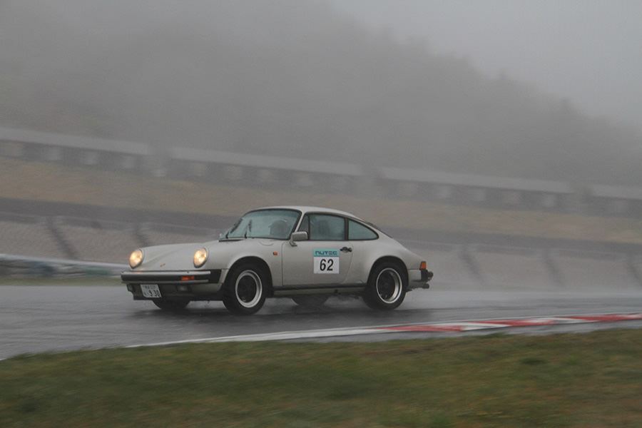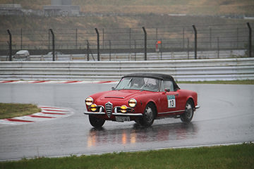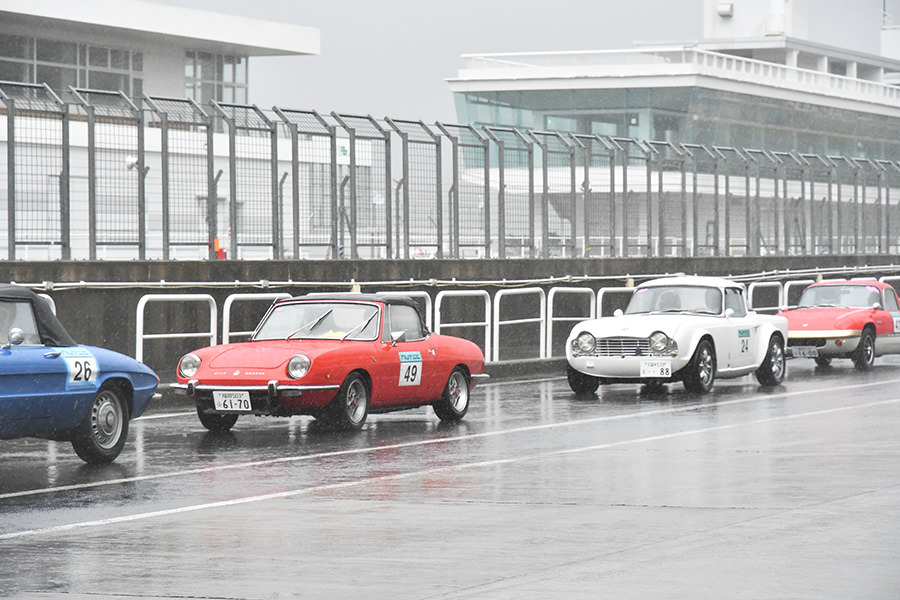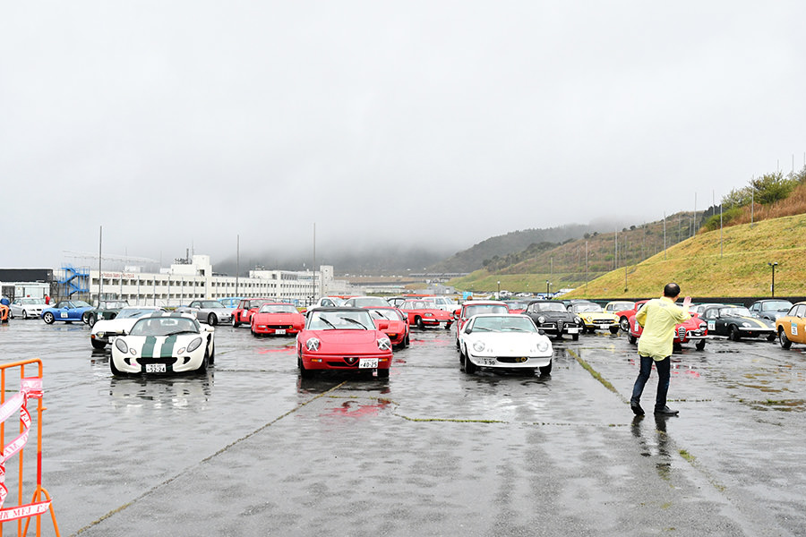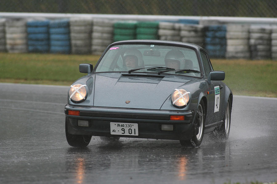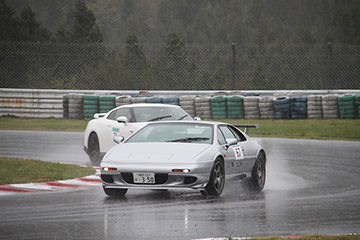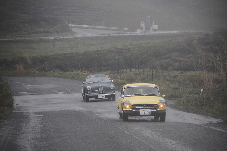 今回のスペシャルステージは上津江町のオートポリスが設定されました。F1にも対応できる国際格式サーキットをヒストリックカーが走る姿が期待されましたが……。参加者が到着するころには暴風雨状態となっており、任意で走行することとなりました。レースであれば中止となるほどの多量の雨水が流れるコースを走るのは貴重な体験。ハラハラドキドキ、皆安全最優先で走行を楽しみました。