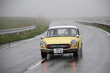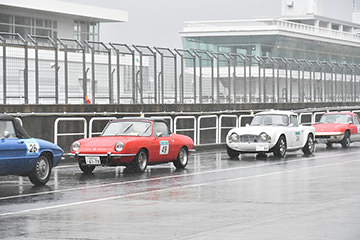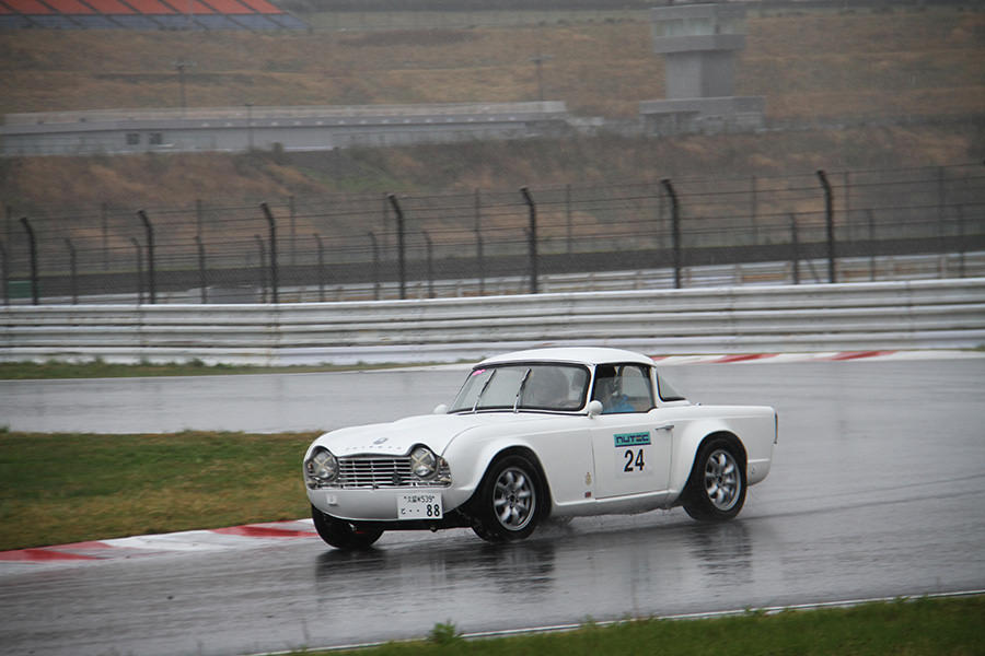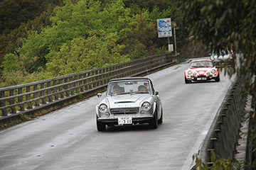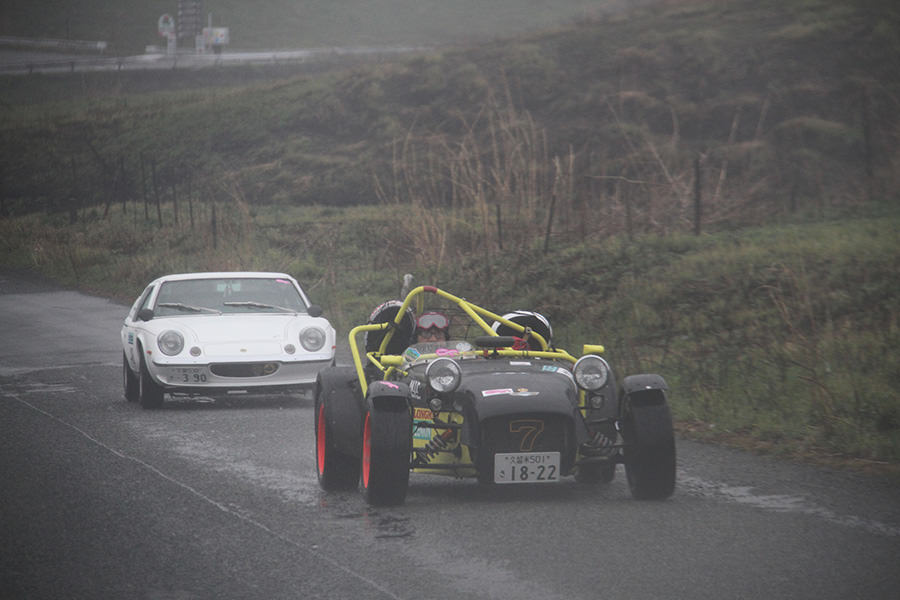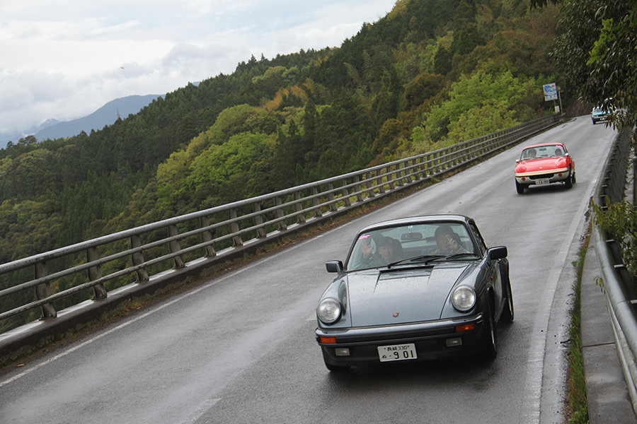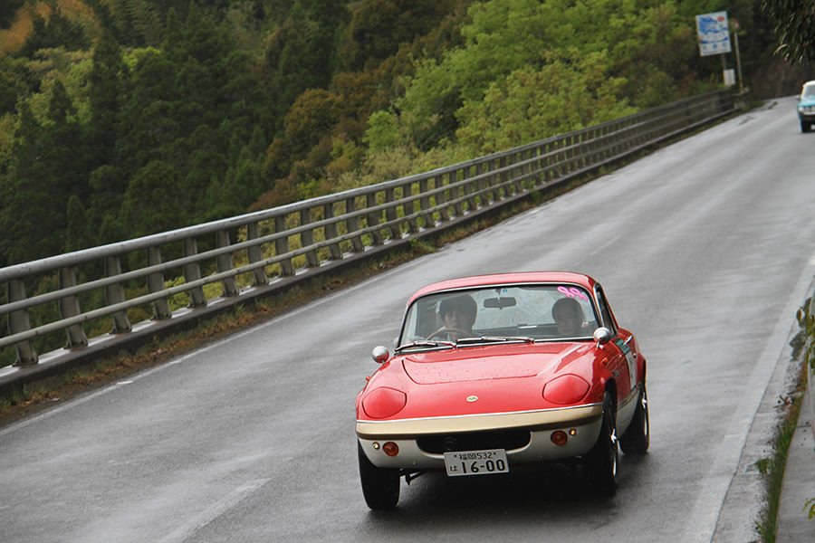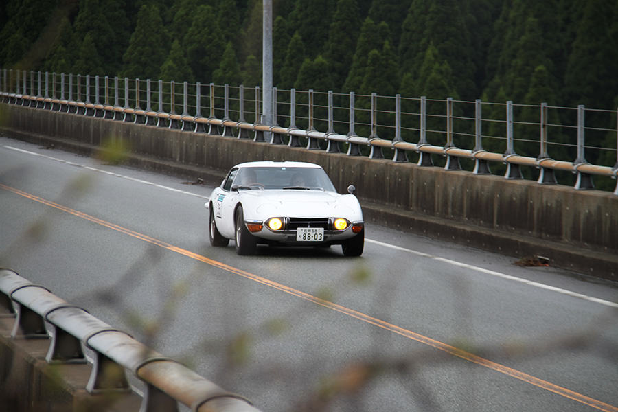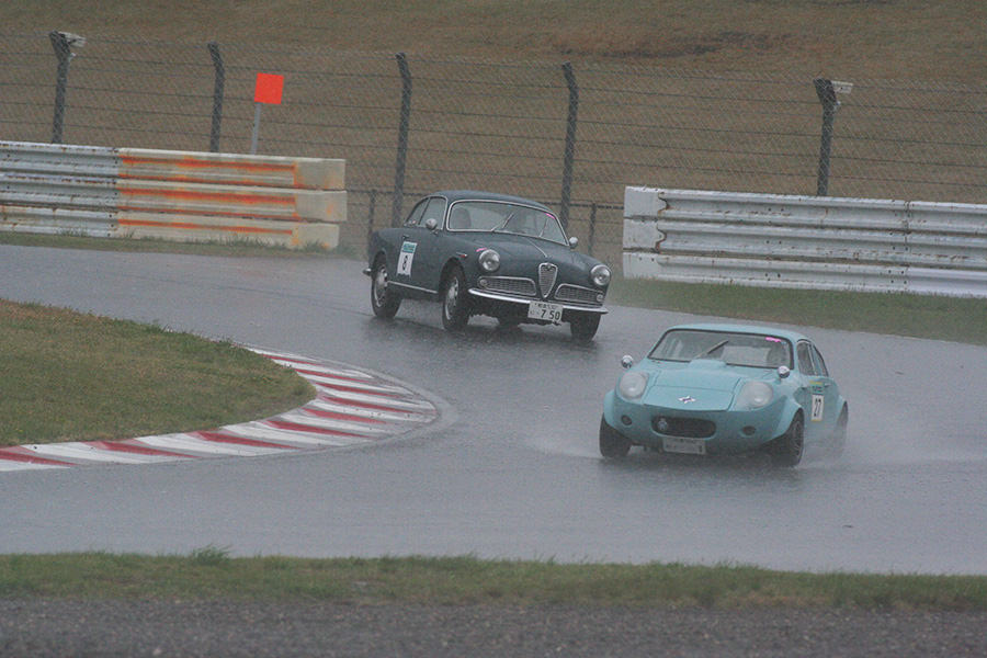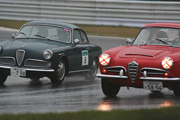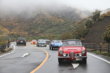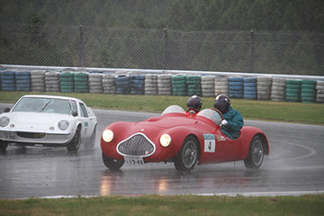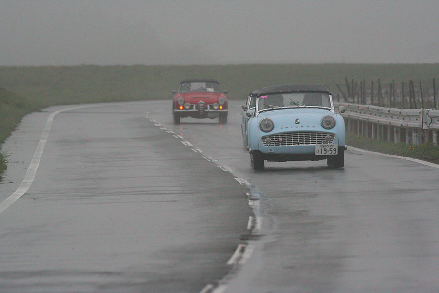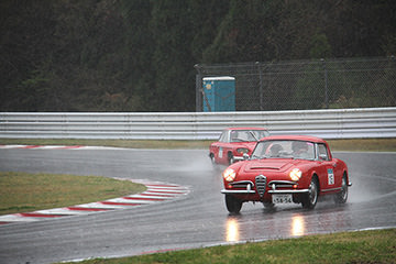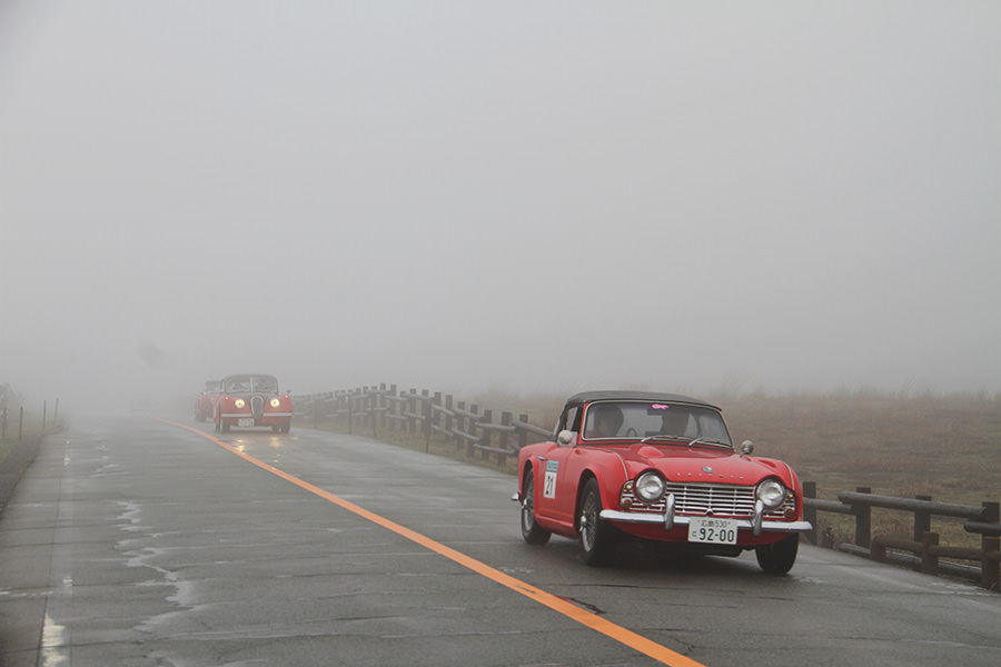 今回のスペシャルステージは上津江町のオートポリスが設定されました。F1にも対応できる国際格式サーキットをヒストリックカーが走る姿が期待されましたが……。参加者が到着するころには暴風雨状態となっており、任意で走行することとなりました。レースであれば中止となるほどの多量の雨水が流れるコースを走るのは貴重な体験。ハラハラドキドキ、皆安全最優先で走行を楽しみました。