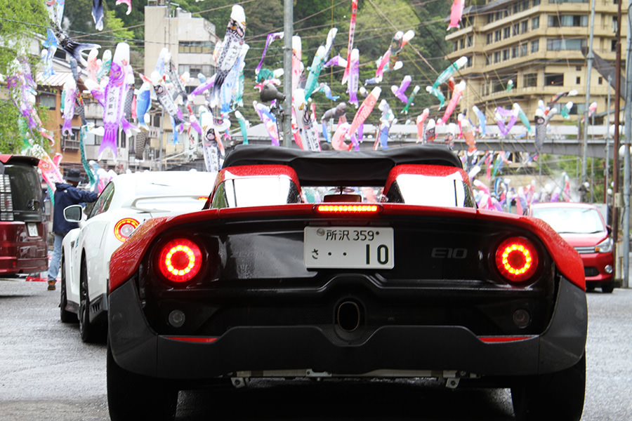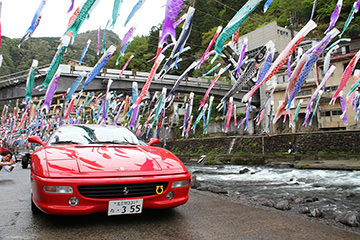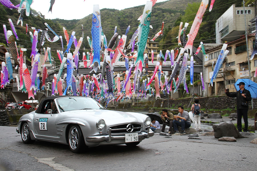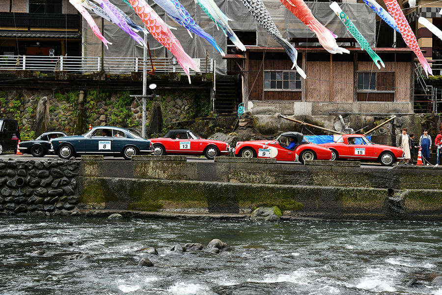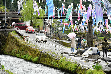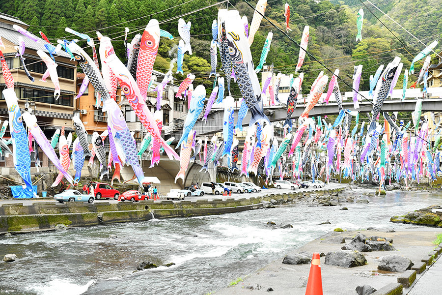 豆田町から国道212号線を南下、松原ダムを過ぎていくと次のチェックポイントである杖立温泉街に到着です。ちょうど「鯉のぼりまつり」が開催されている時期で、川の上には無数の鯉のぼりがユラユラと泳いでいる様子が楽しめました。