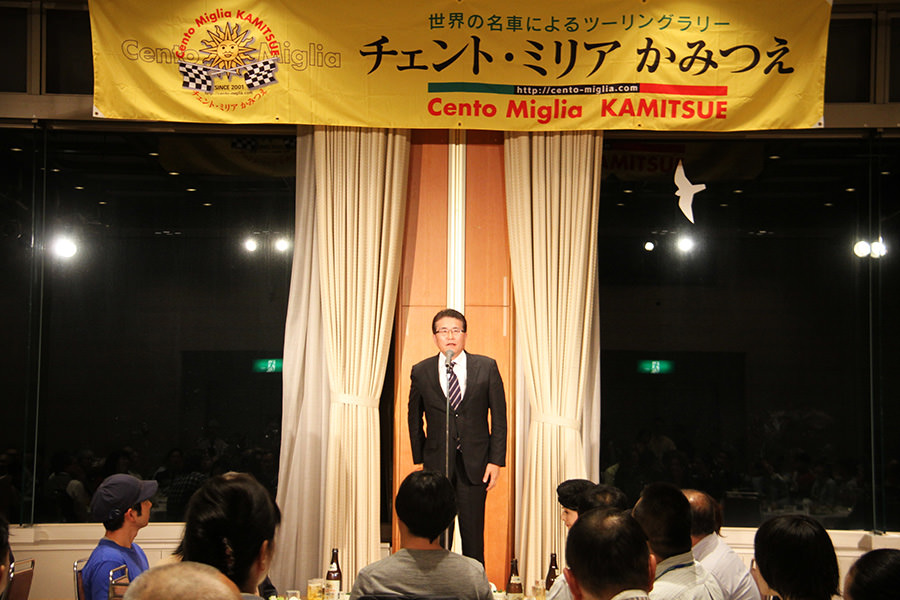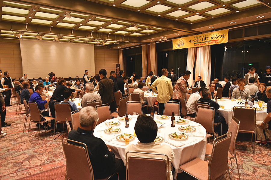 ディナーパーティーは、様々な参加者が交流しやすいようにランダムにテーブル席が決められていて、ベテランと初参加者が同じテーブルで交流できるようになっていました。豪華景品があたるじゃんけん大会は大盛り上がり!南阿蘇村長の吉良清一さんの挨拶にはじまり、スペシャルゲストとして女優の夏樹陽子さんも登場し、楽しい充実したディナーとなりました。