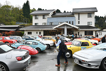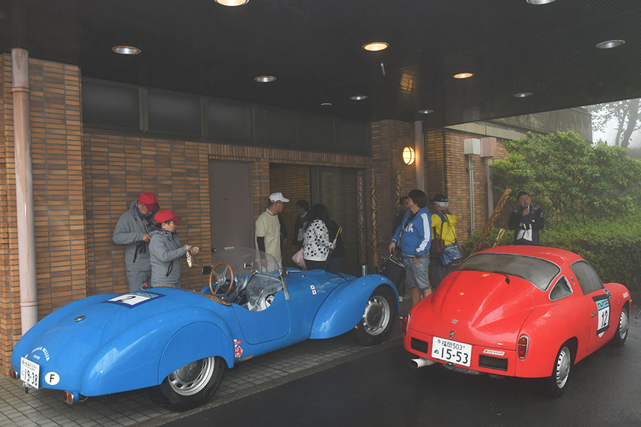 初日のゴールは恒例の「阿蘇リゾートグランヴィリオホテル」。暴風雨に晒されたヒストリックカーを一刻も早く休ませるために、夕刻前に続々とゴールしてきました。ディナーパーティーの時間までは併設されている温泉に浸かりリフレッシュ。冷えきった身体を温めて元気を回復しました。