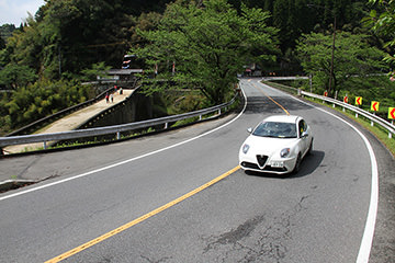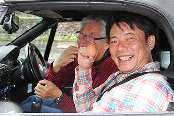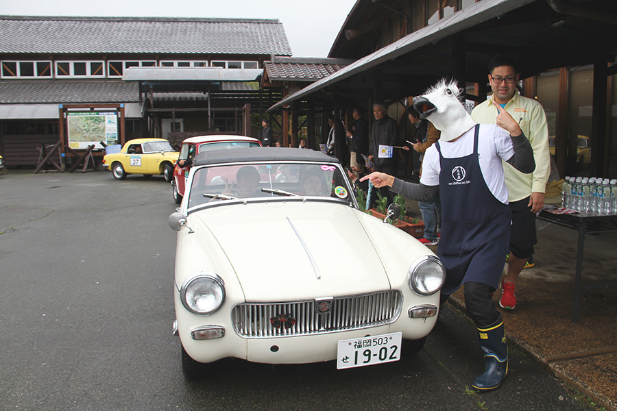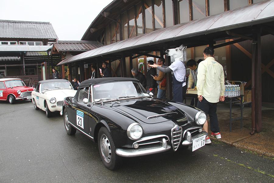 草千里から南阿蘇村に降りてきて、次なるポイントとなった「阿蘇白水温泉“瑠璃”」。温泉に入りたい気持ちをグッとこらえて、阿蘇の伏流水のご当地ミネラルウォーターを受け取ります。風情のある建物とヒストリックカーのコラボが温泉客にもウケていたようです。