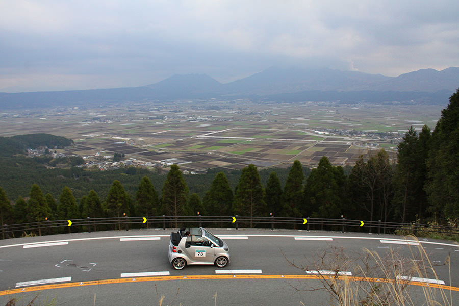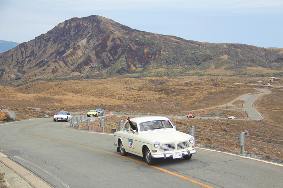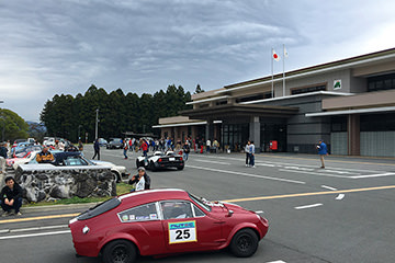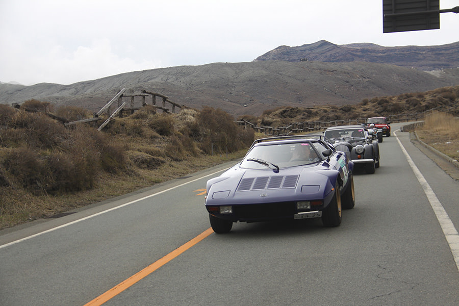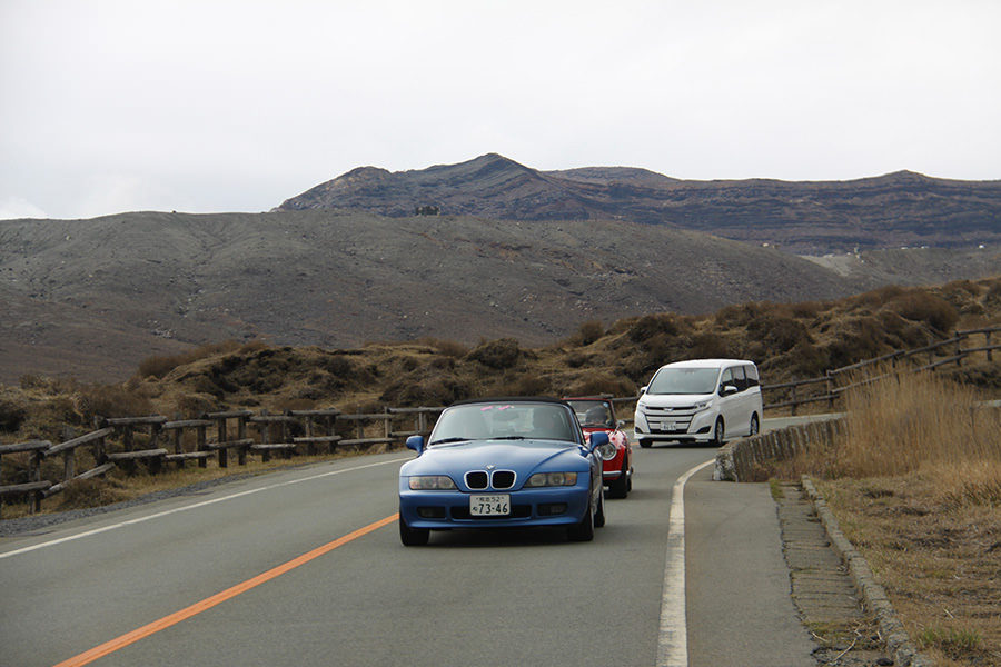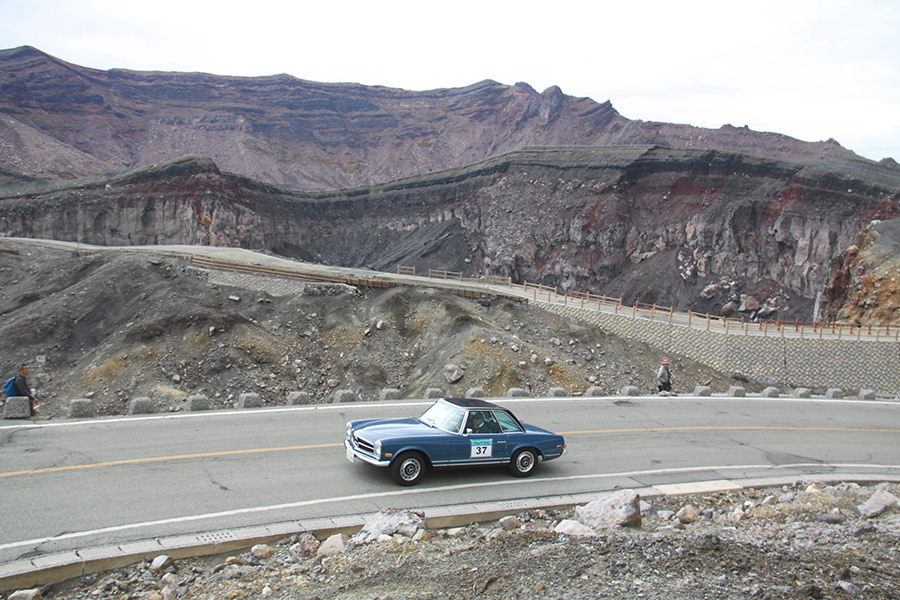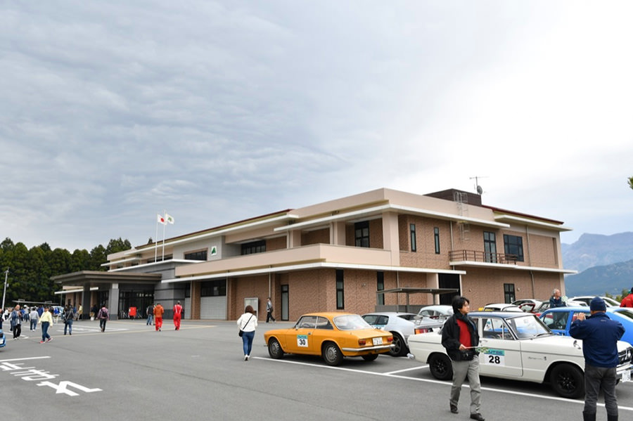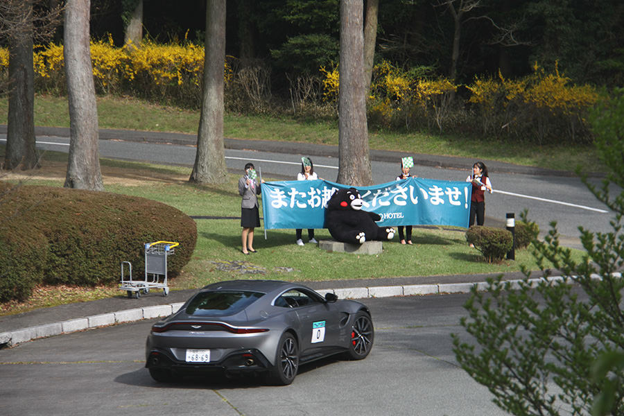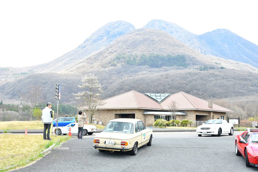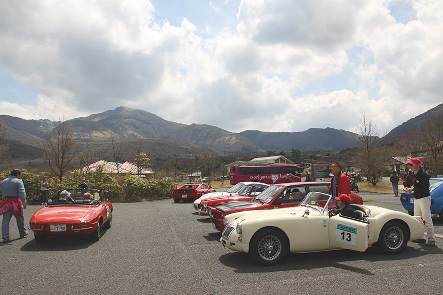 一夜明けて、チェント・ミリア最終日がやってきました。ゆったりとホテルの朝食をいただき、チェックアウト。駐車場にて、ドライバーズブリーフィングがスタートしました。前日からこの日最初のチェックポイントである「阿蘇中岳火口」に行けるかどうかという判断を待っている状態でした。そして朝を迎えたタイミングで無事OKの連絡が!1時間ごとに刻々と状況が変わる火口の様子にスタッフもドキドキでした。 阿蘇リゾートグランヴィリオホテルのエントランス前では、ホテルスタッフがお見送りをしてくださいました。他の宿泊客の方々も、駐車場にやってきて、貴重で珍しいクルマたちを見学している姿が印象的でした。