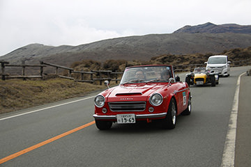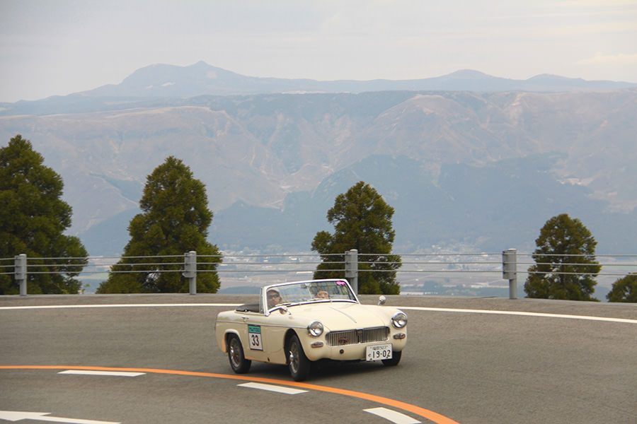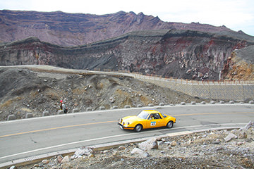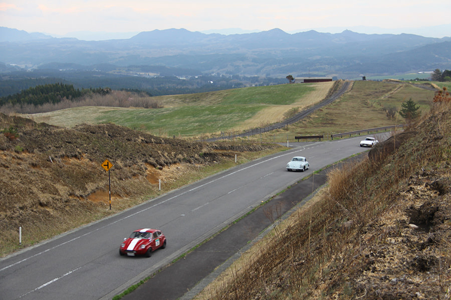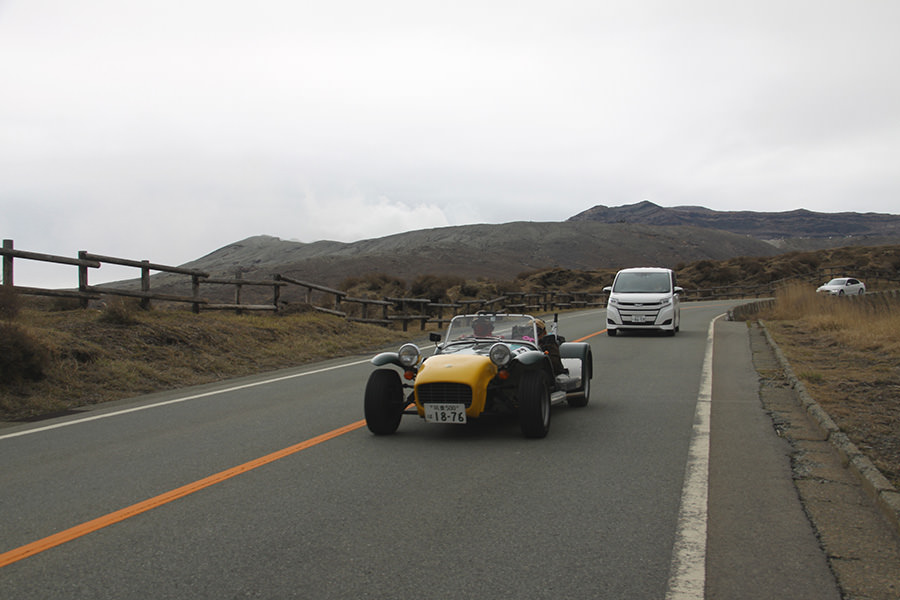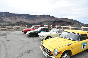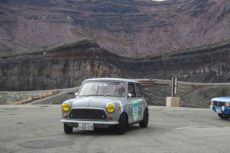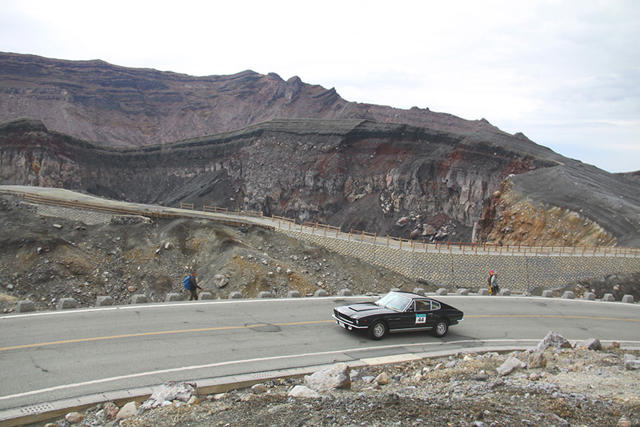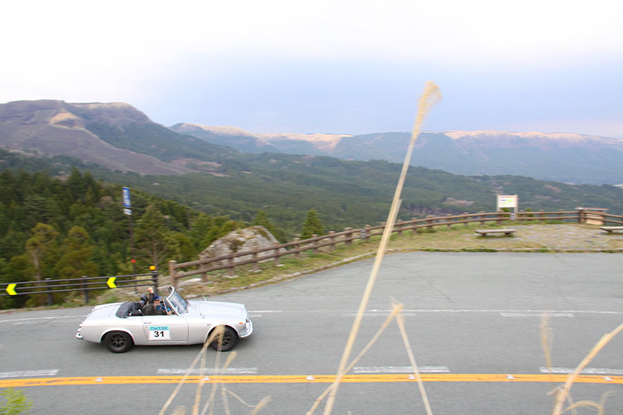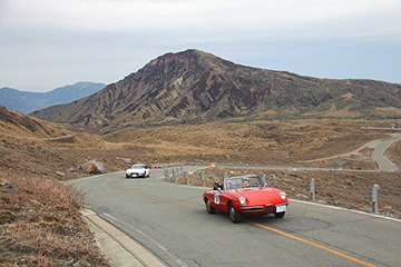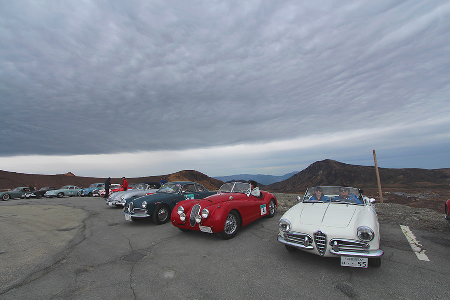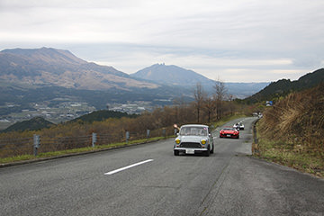 一夜明けて、チェント・ミリア最終日がやってきました。ゆったりとホテルの朝食をいただき、チェックアウト。駐車場にて、ドライバーズブリーフィングがスタートしました。前日からこの日最初のチェックポイントである「阿蘇中岳火口」に行けるかどうかという判断を待っている状態でした。そして朝を迎えたタイミングで無事OKの連絡が!1時間ごとに刻々と状況が変わる火口の様子にスタッフもドキドキでした。 阿蘇リゾートグランヴィリオホテルのエントランス前では、ホテルスタッフがお見送りをしてくださいました。他の宿泊客の方々も、駐車場にやってきて、貴重で珍しいクルマたちを見学している姿が印象的でした。