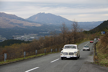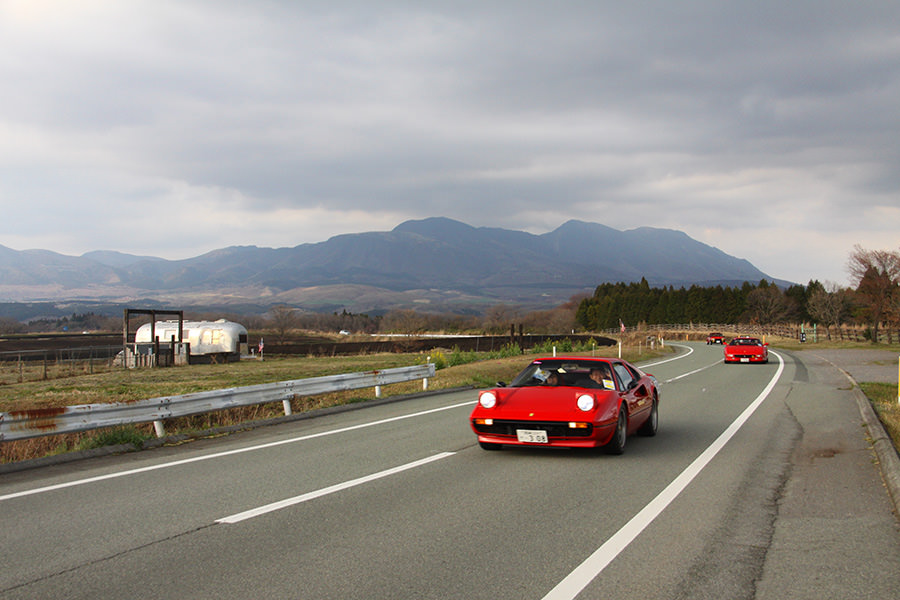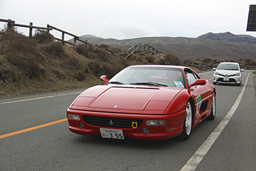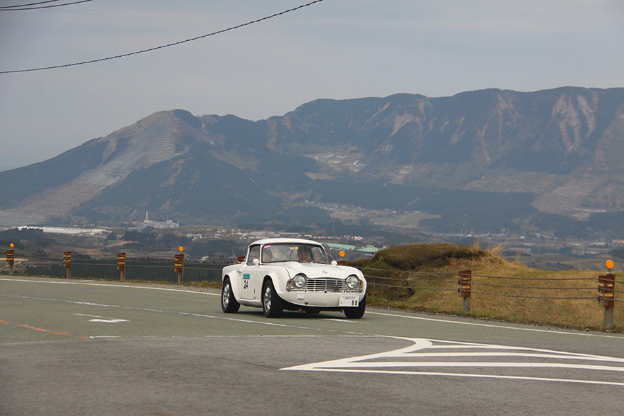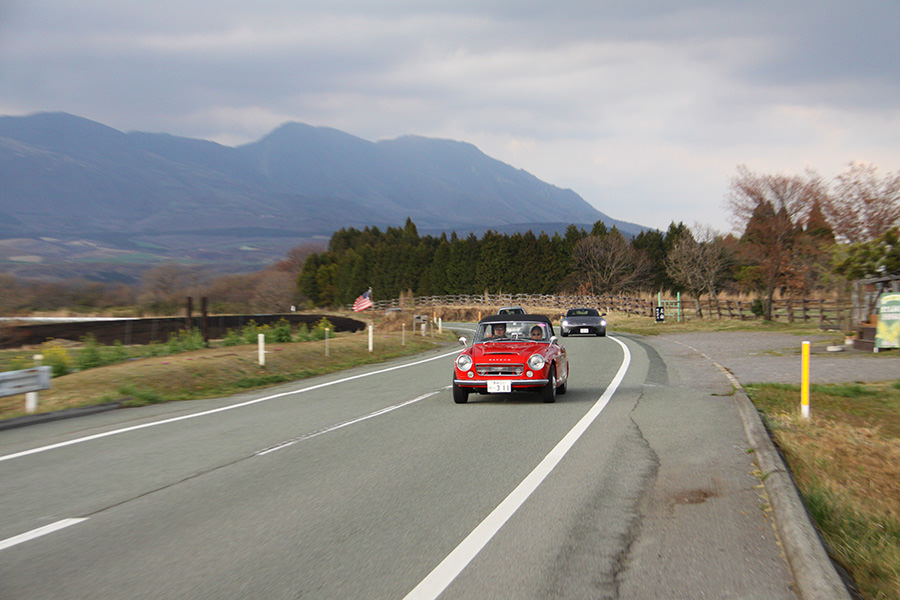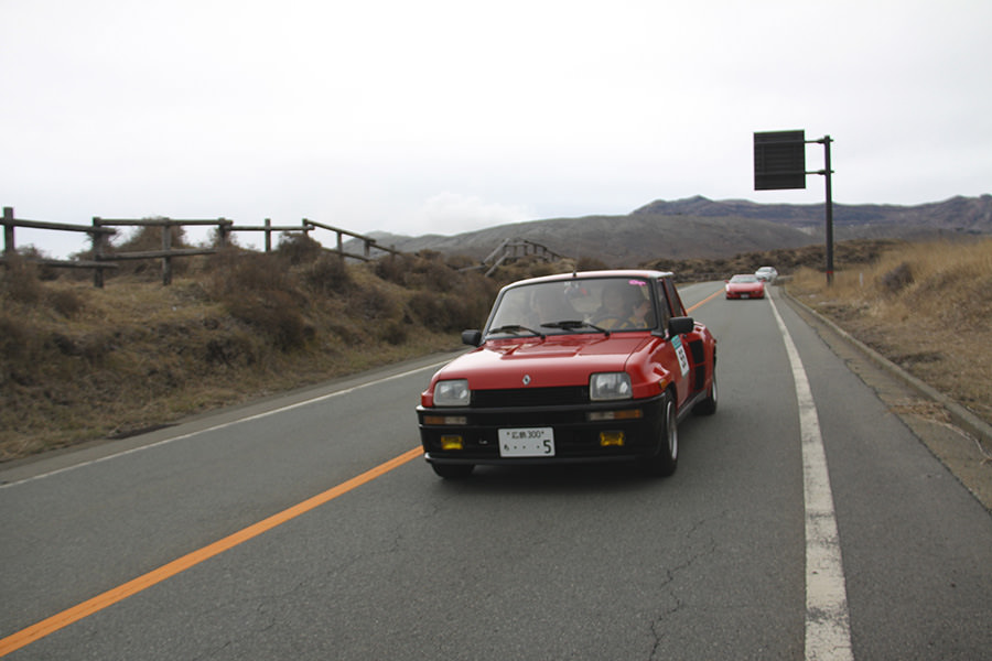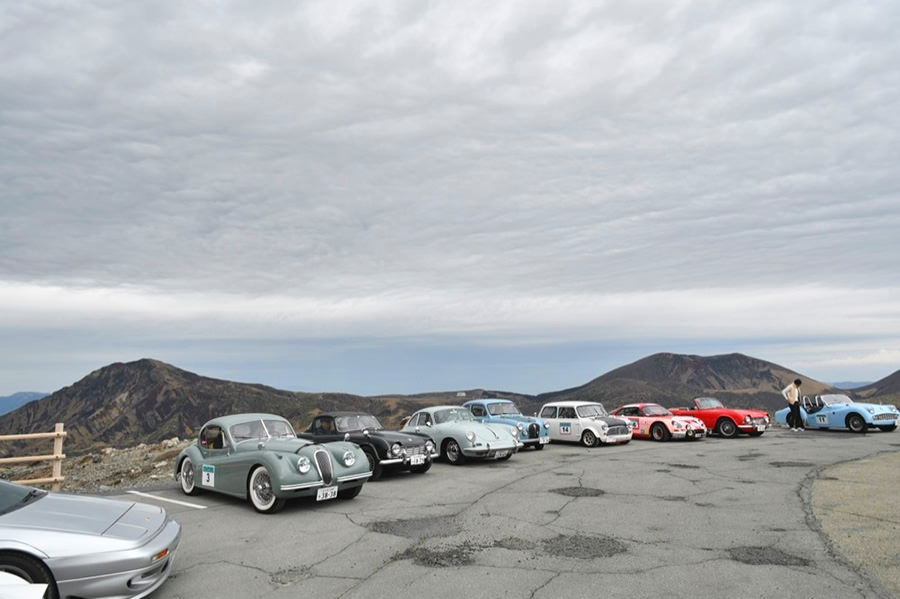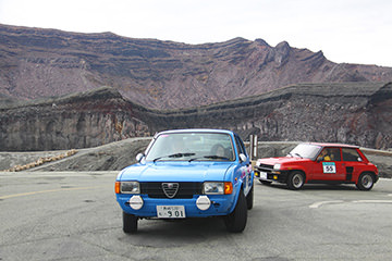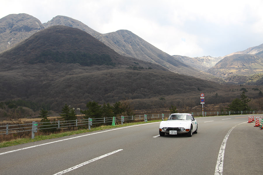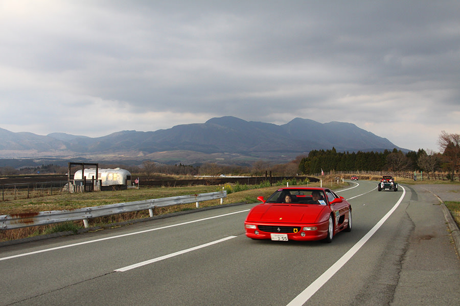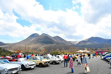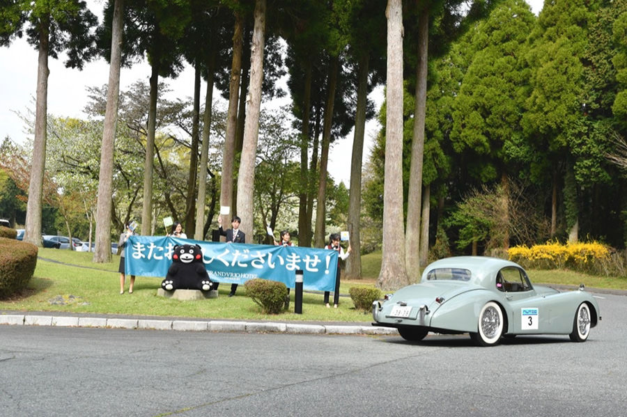 一夜明けて、チェント・ミリア最終日がやってきました。ゆったりとホテルの朝食をいただき、チェックアウト。駐車場にて、ドライバーズブリーフィングがスタートしました。前日からこの日最初のチェックポイントである「阿蘇中岳火口」に行けるかどうかという判断を待っている状態でした。そして朝を迎えたタイミングで無事OKの連絡が!1時間ごとに刻々と状況が変わる火口の様子にスタッフもドキドキでした。 阿蘇リゾートグランヴィリオホテルのエントランス前では、ホテルスタッフがお見送りをしてくださいました。他の宿泊客の方々も、駐車場にやってきて、貴重で珍しいクルマたちを見学している姿が印象的でした。