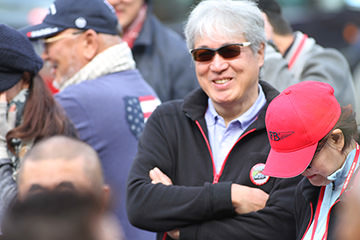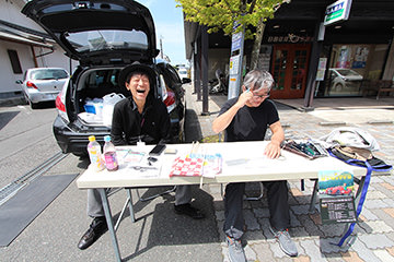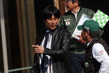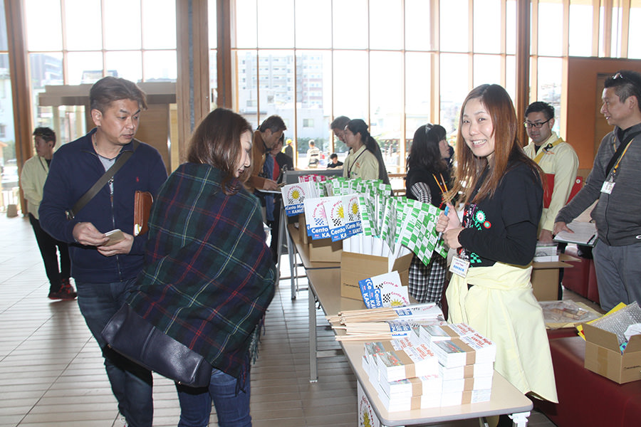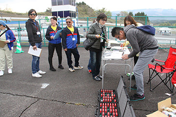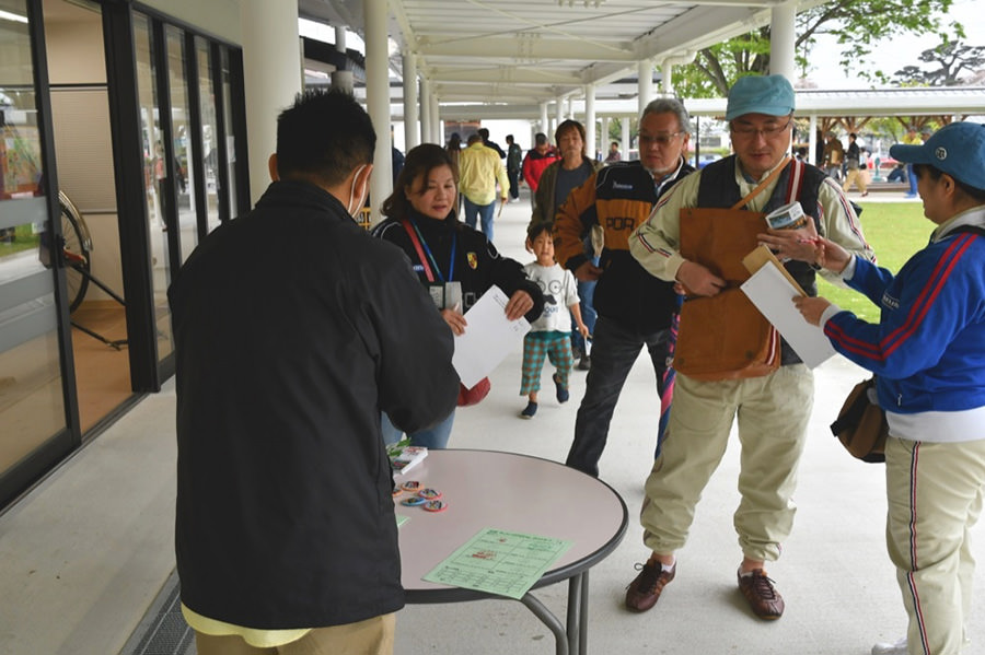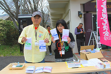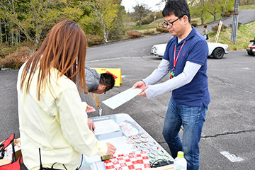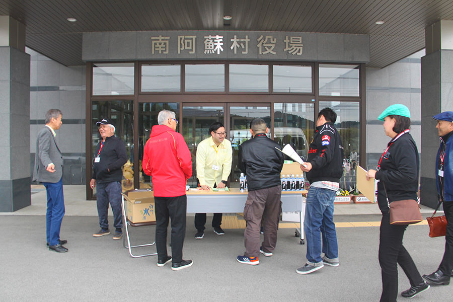 阿蘇中岳火口を見学し、南登山道を下りて次に向かうのは「南阿蘇村役場」。ここではサイコロの目によるポイント加算が行われていました。参加者は皆大盛り上がり!阿蘇白川水源のペットボトルがプレゼントされ、ここでも近隣から集まった多くの方からフラッグを振って応援していただきました