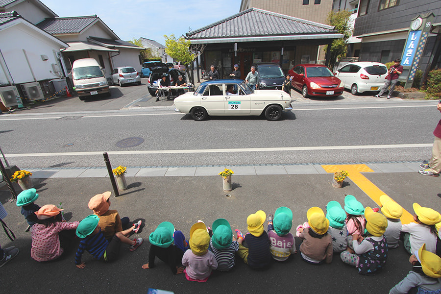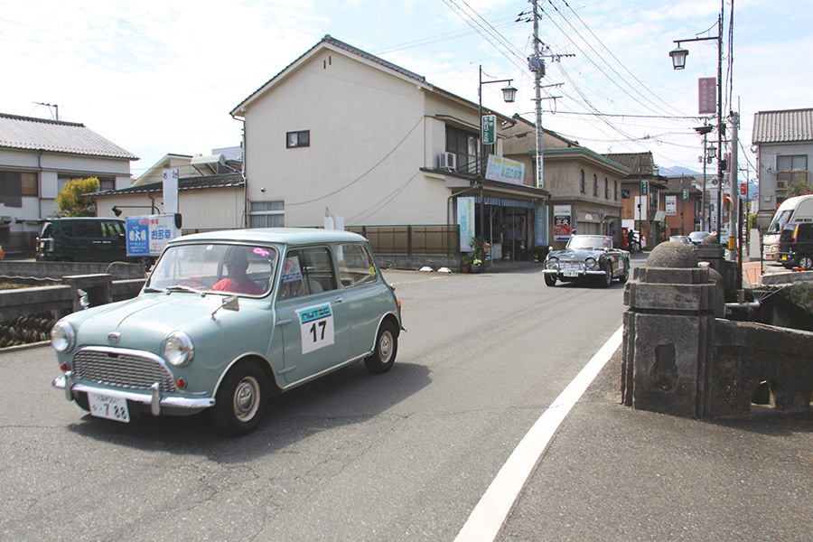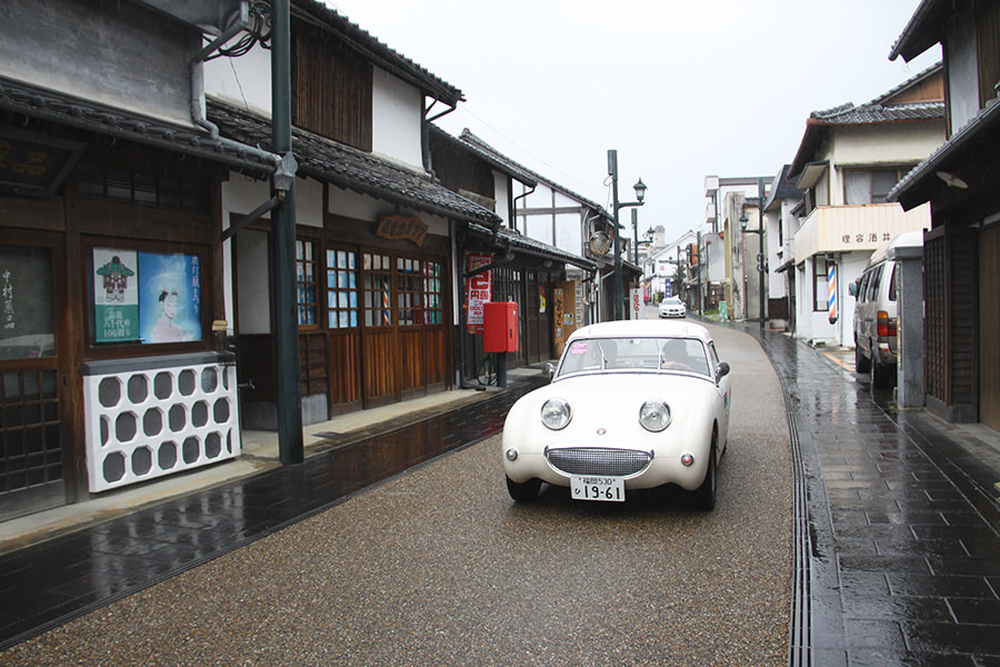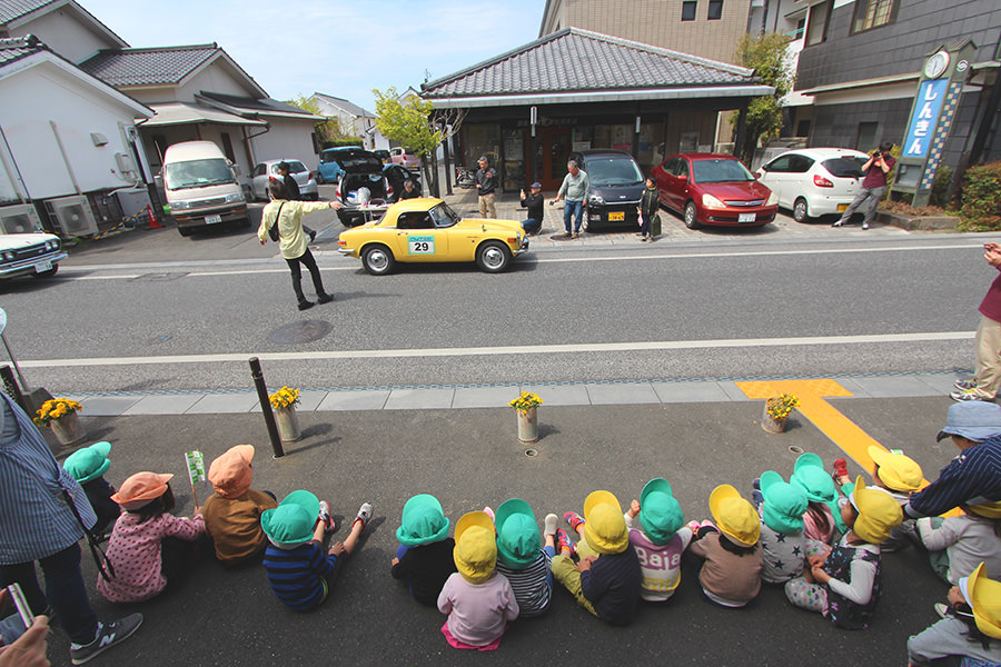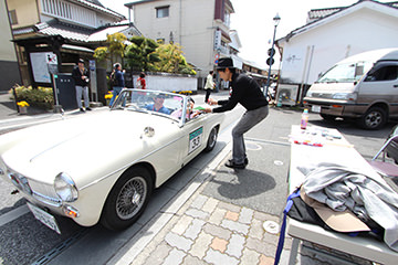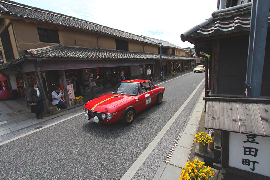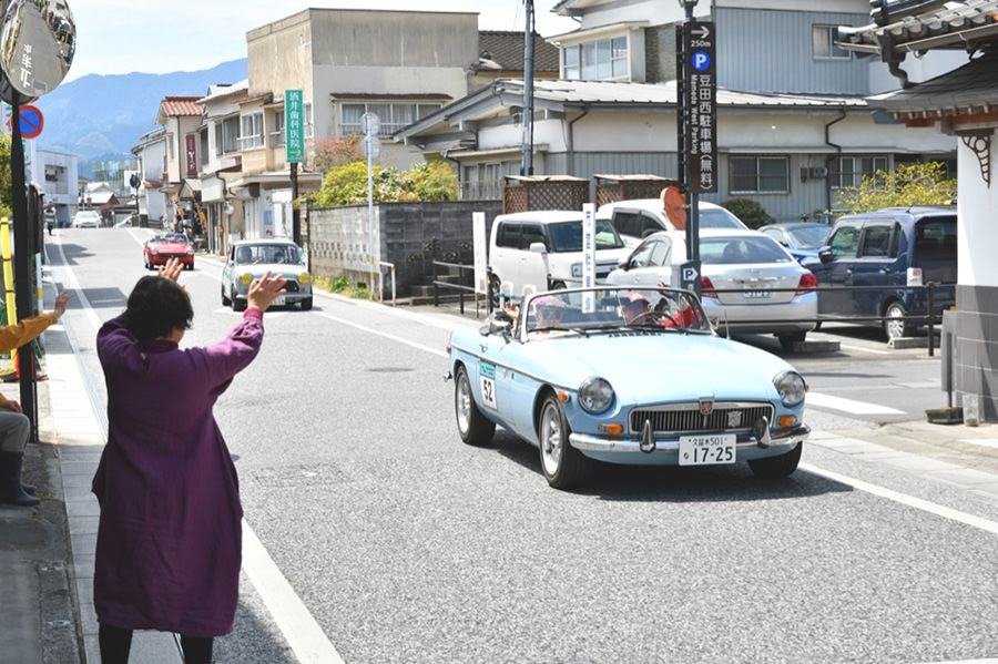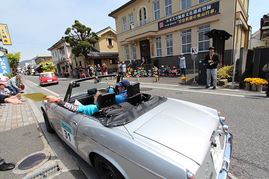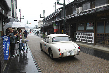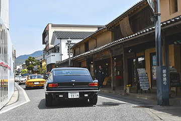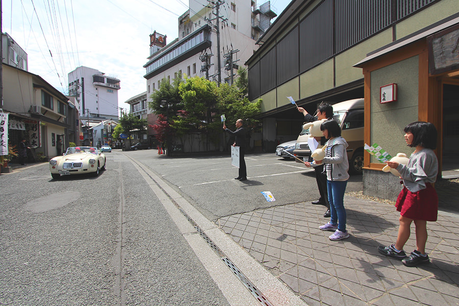 「日田温泉街・豆田町」スタンプポイントの前には地元の子どもたちが応援に駆けつけてくれました。江戸時代以降に建てられた建築物が立ち並ぶこの一帯は、国の“重要伝統的建造物群保存地区“に定められていて、クラシックカーとのマッチングも見事な場所として、“チェント・ミリア”にははずせない場所です。