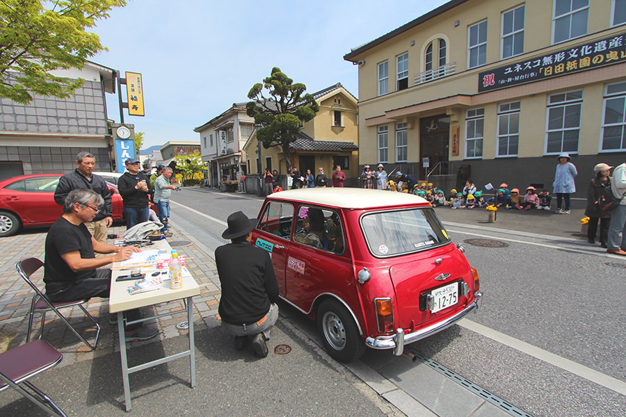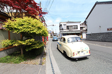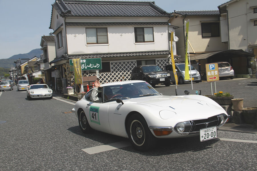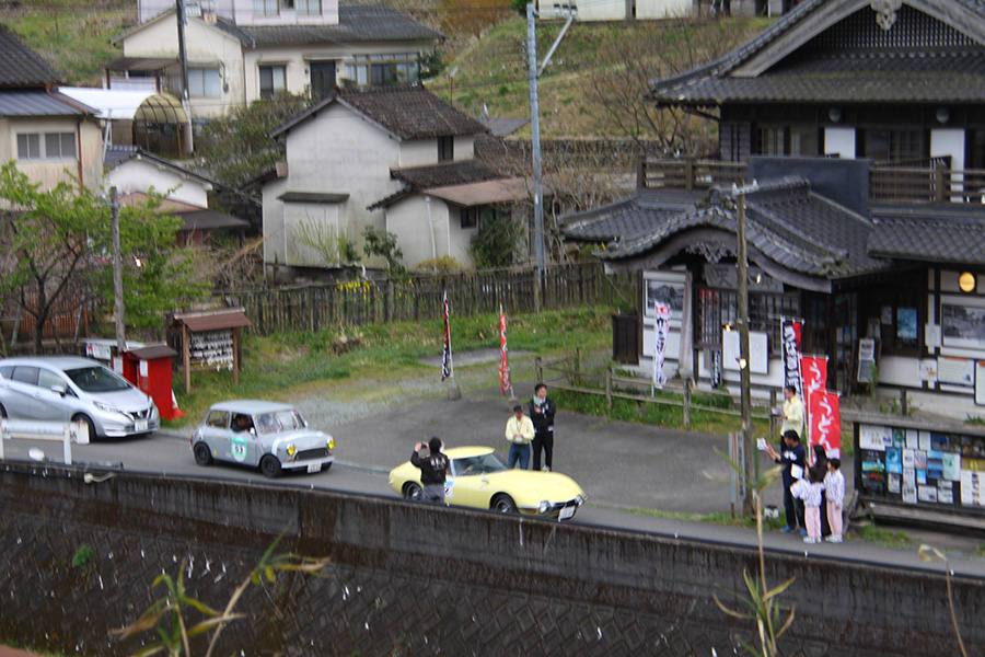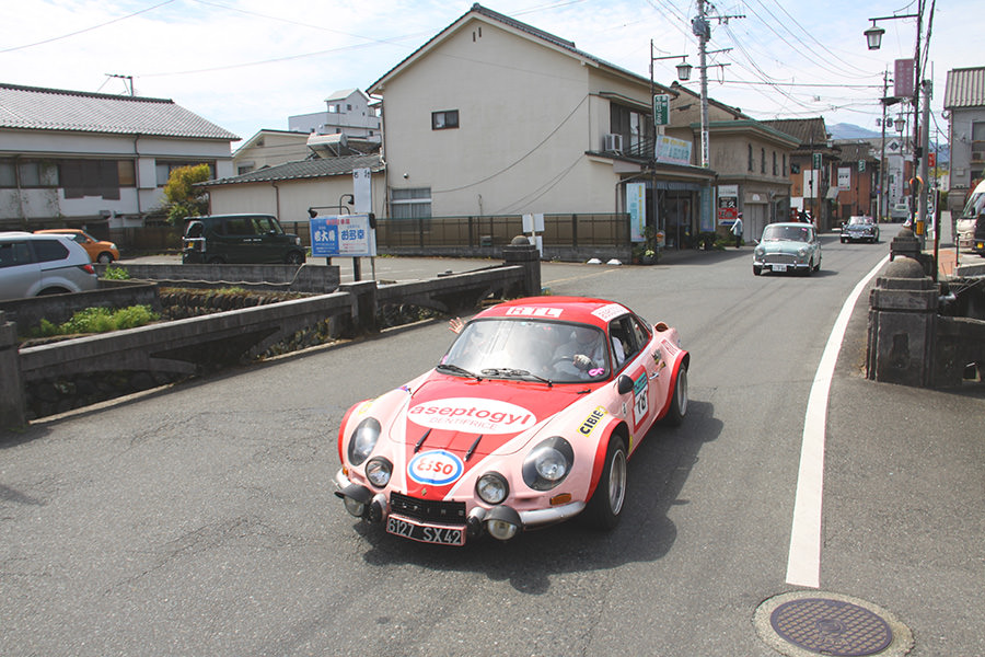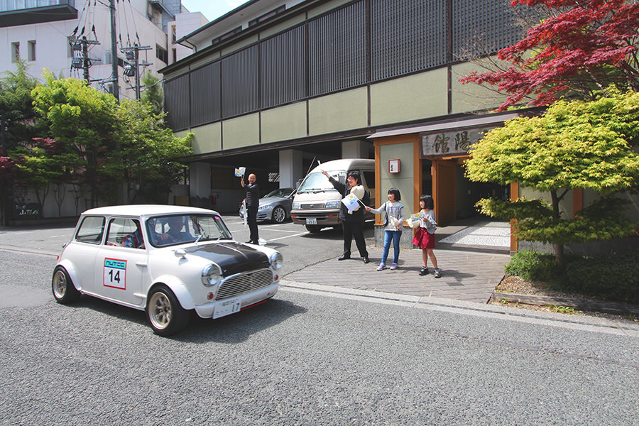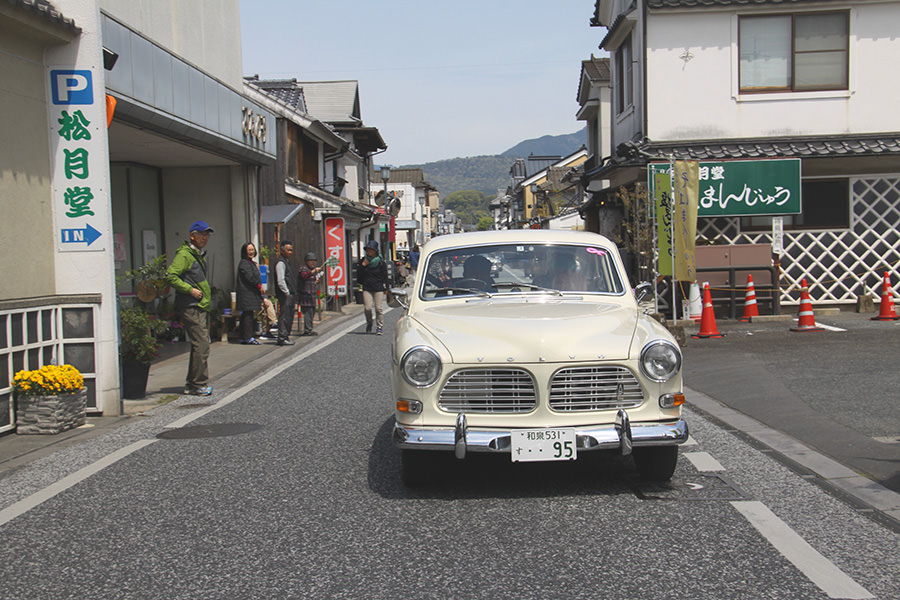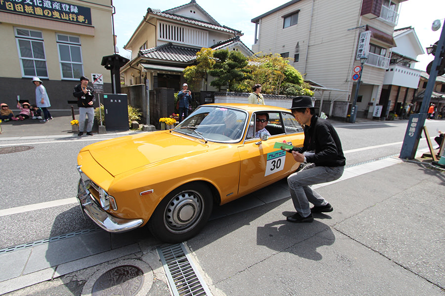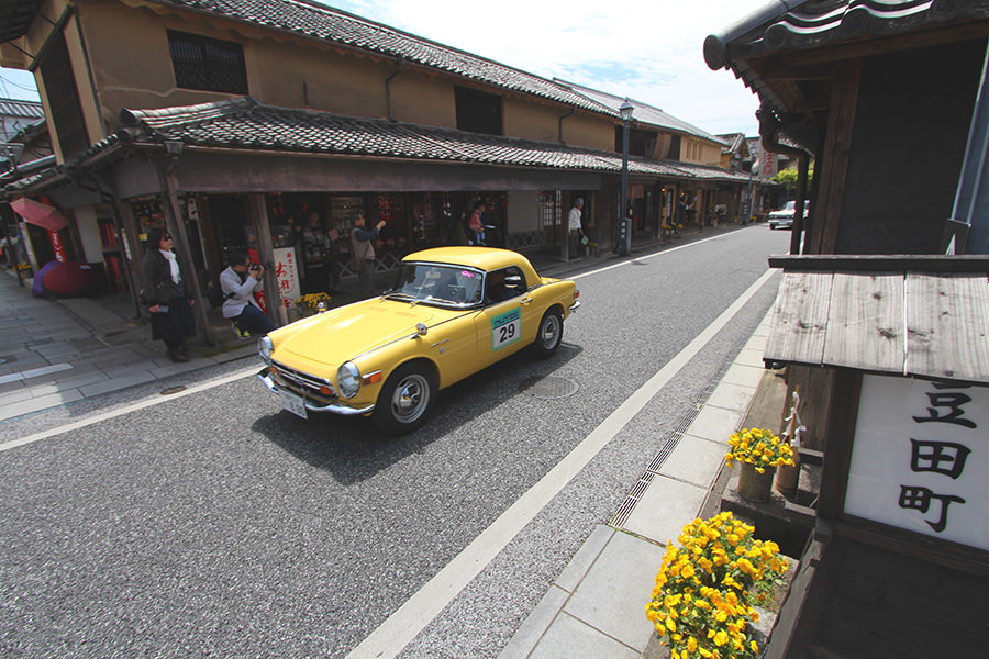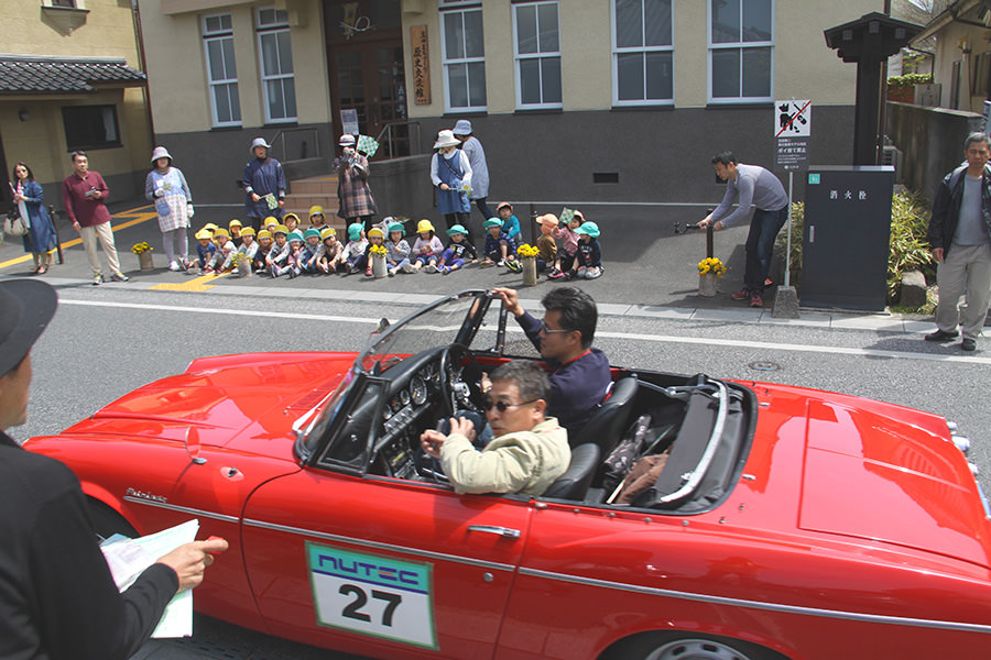 「日田温泉街・豆田町」スタンプポイントの前には地元の子どもたちが応援に駆けつけてくれました。江戸時代以降に建てられた建築物が立ち並ぶこの一帯は、国の“重要伝統的建造物群保存地区“に定められていて、クラシックカーとのマッチングも見事な場所として、“チェント・ミリア”にははずせない場所です。