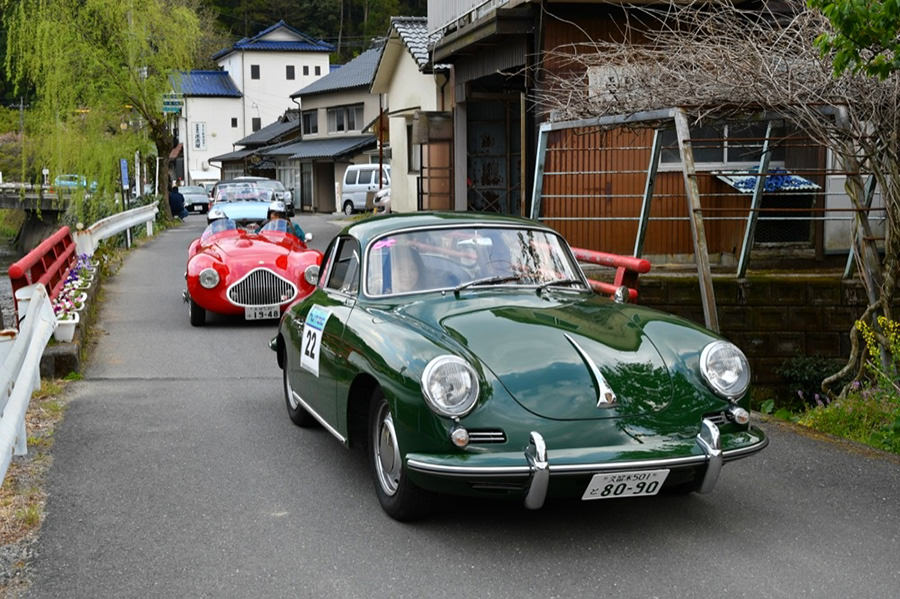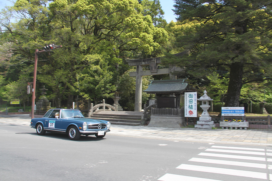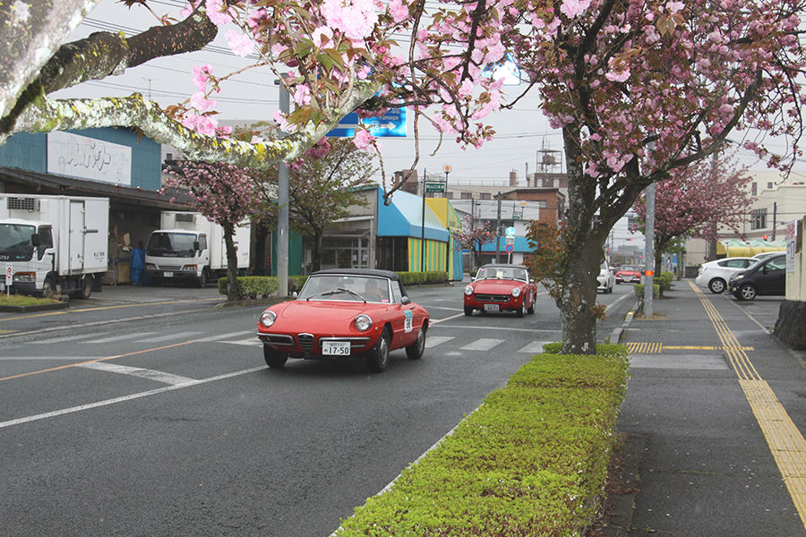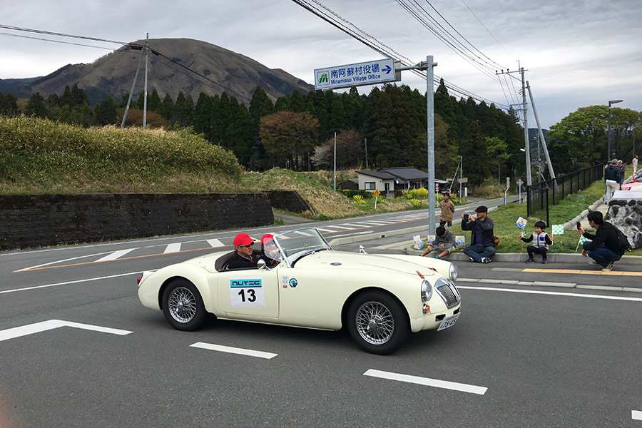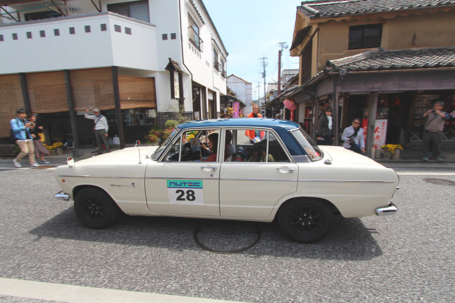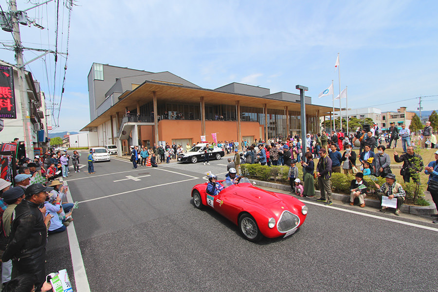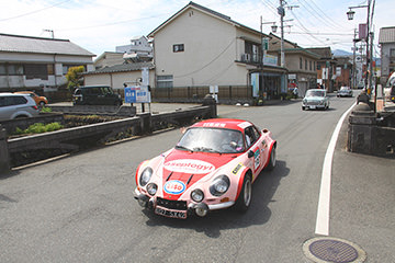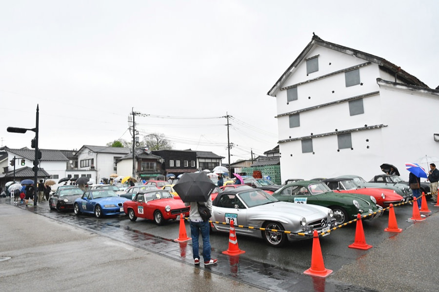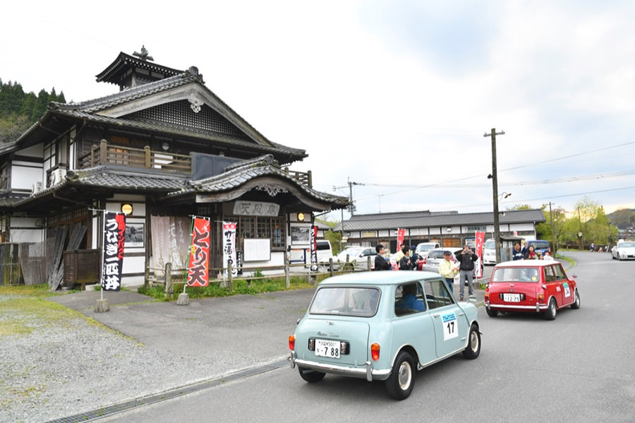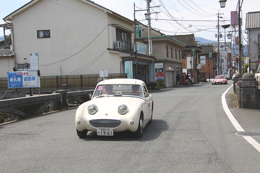 「日田温泉街・豆田町」スタンプポイントの前には地元の子どもたちが応援に駆けつけてくれました。江戸時代以降に建てられた建築物が立ち並ぶこの一帯は、国の“重要伝統的建造物群保存地区“に定められていて、クラシックカーとのマッチングも見事な場所として、“チェント・ミリア”にははずせない場所です。