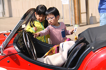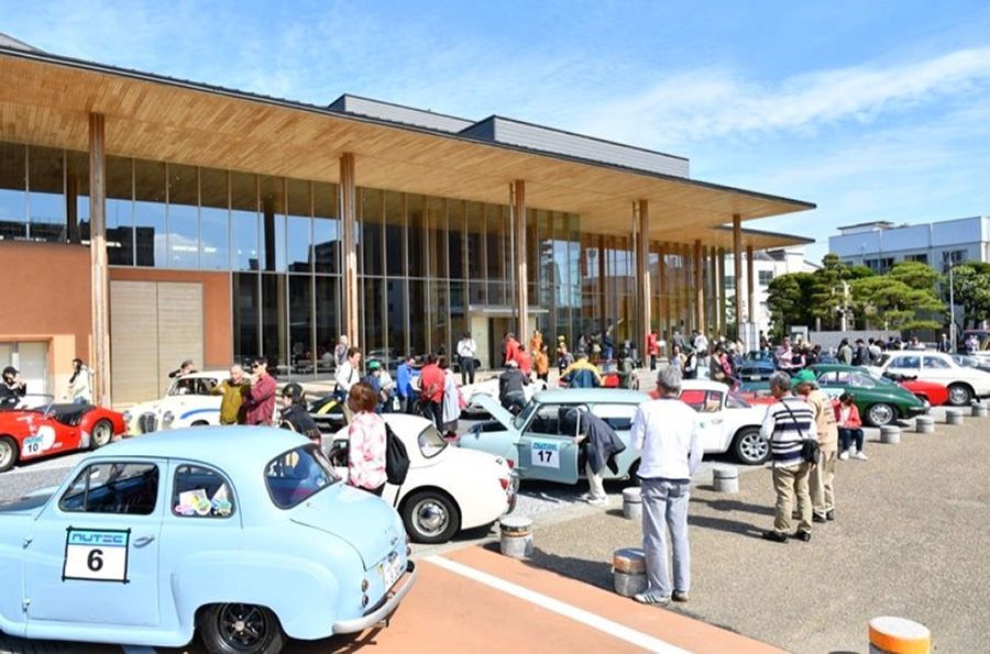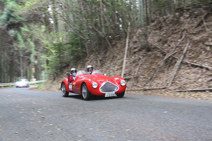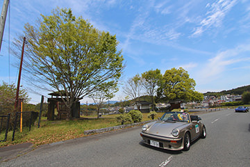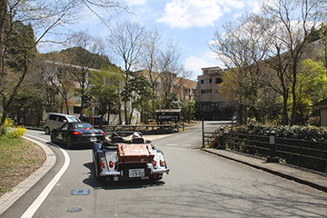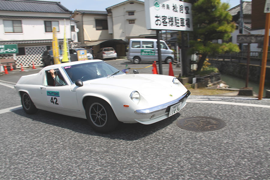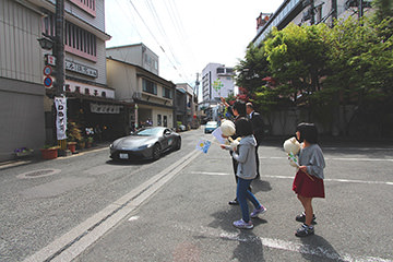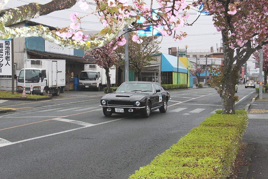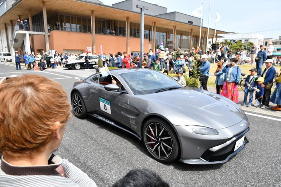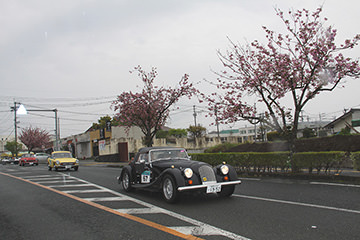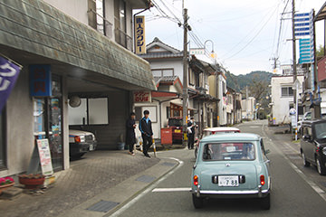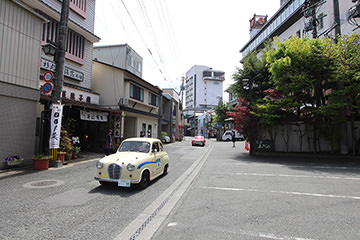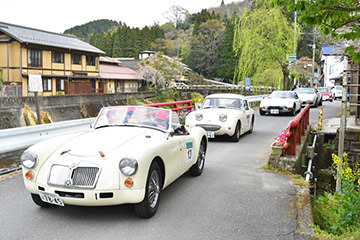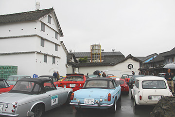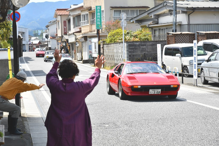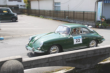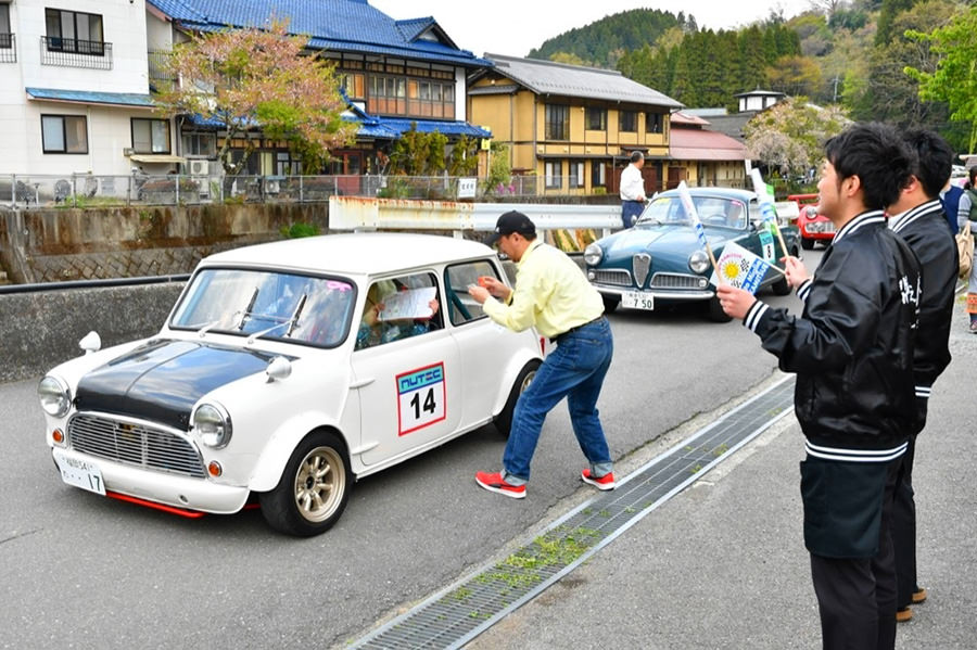 「日田温泉街・豆田町」スタンプポイントの前には地元の子どもたちが応援に駆けつけてくれました。江戸時代以降に建てられた建築物が立ち並ぶこの一帯は、国の“重要伝統的建造物群保存地区“に定められていて、クラシックカーとのマッチングも見事な場所として、“チェント・ミリア”にははずせない場所です。
