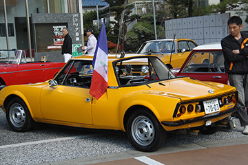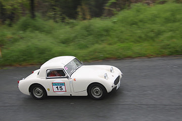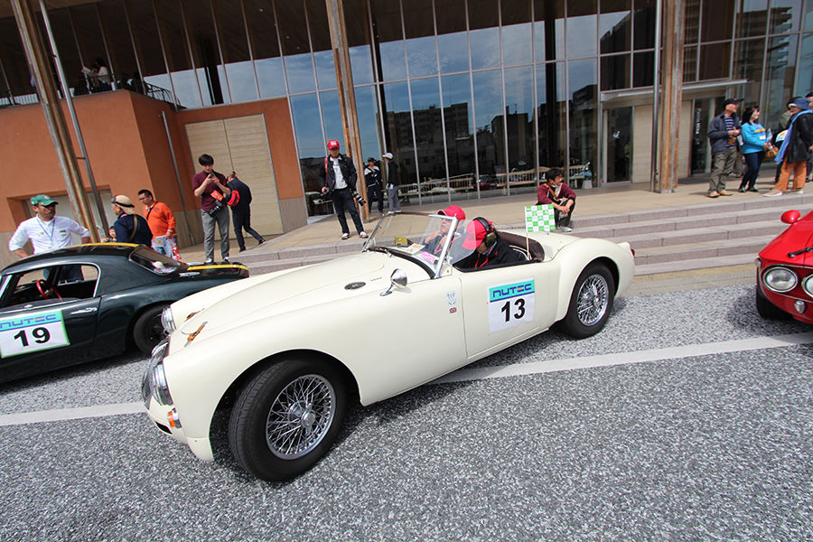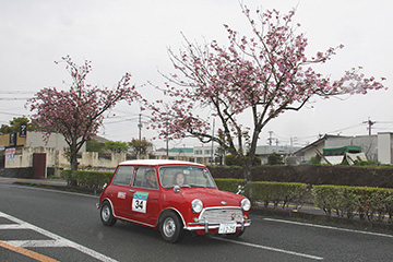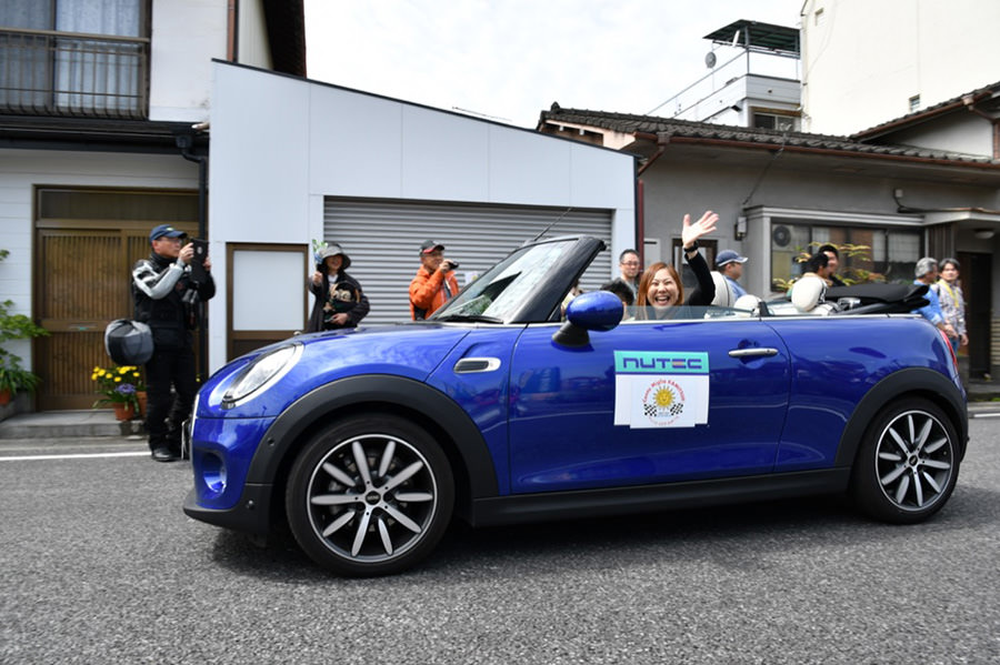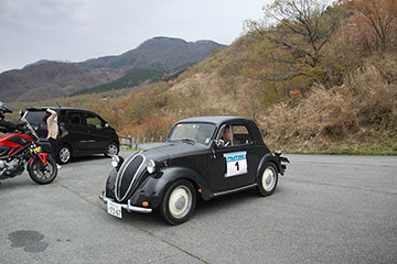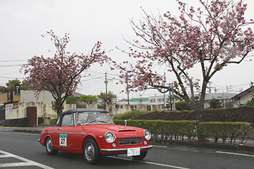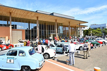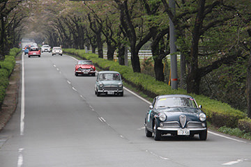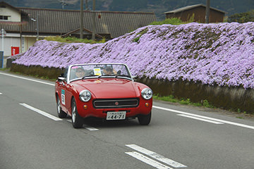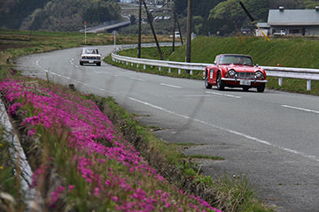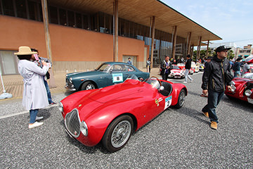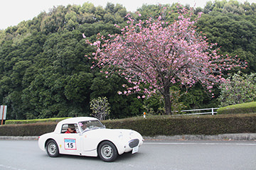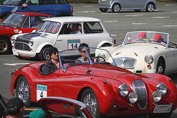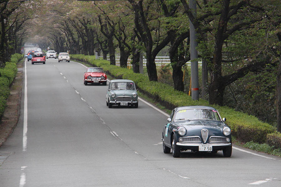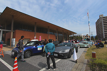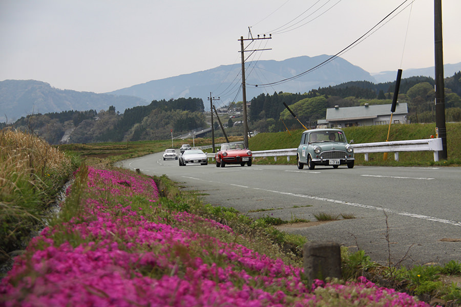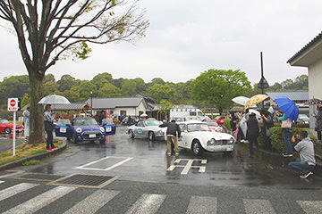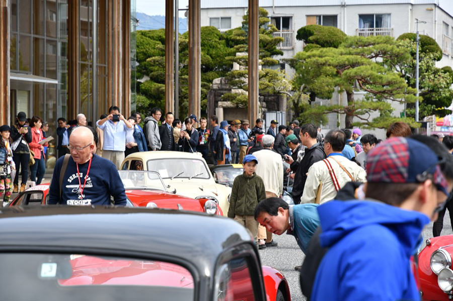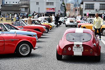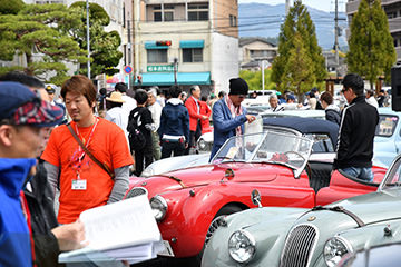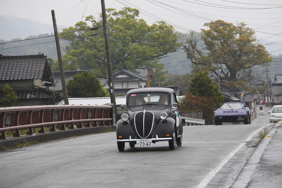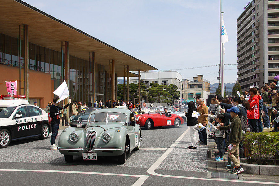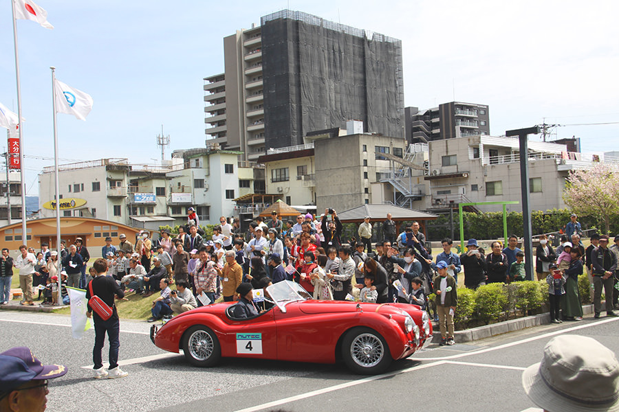 「パトリア日田」と「中央公園」の間には、所狭しと世界の名車たちが並びます。「パトリア日田」の大ホールにて開会式が行われ大分県議会井上議長、日田市商工観光部中島部長、日田警察署正成交通課長のご挨拶や参加者による交通安全宣言などが行われました。外に出るといよいよスタート。生産年式の古い順にゼッケンが決定するので、今年のゼッケン1番は1934年製フィアット500(トッポリーノ)。映画「ローマの休日」にも使われたイタリアの名車です。車両とチームが順番に紹介され、沿道の多くのギャラリーの声援やフラッグでの応援を受け、世界の名車たちがスタートしていきます。初日は、天候にも恵まれ絶好のツーリング日和となりました。