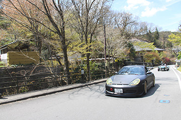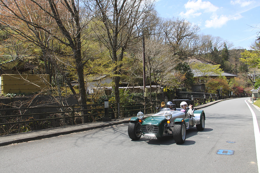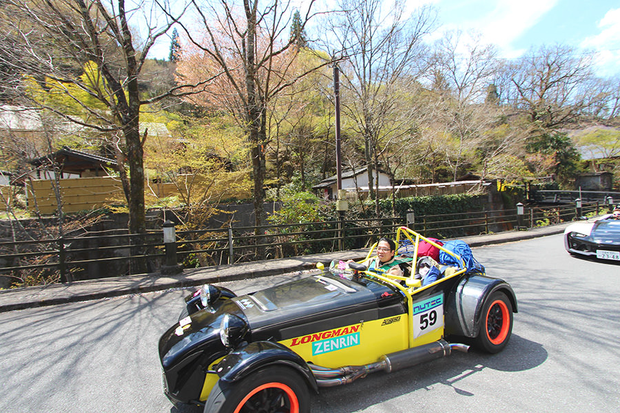 サーキット走行を存分に楽しんだ後、風情ある商店街と温泉街を抜けると「長湯温泉“ガニ湯”」が初日最後のスタンプポイント。川沿いにある“ガニ湯“前で、多くのギャラリーに迎えられながらスタンプを押してもらい初日のゴール、「阿蘇リゾードグランヴィリオホテル」を目指します。