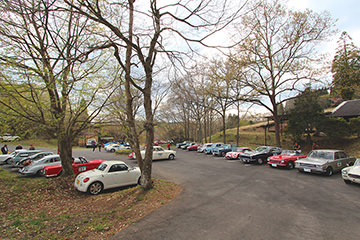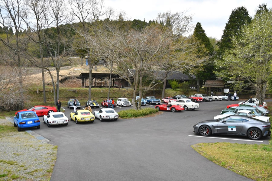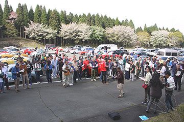 「阿蘇リゾードグランヴィリオホテル」の特設駐車スペースに続々と参加車両が到着し、参加者一行はチェックイン。車両のチェックをしつつ夜の懇親パーティーまで小休憩。早速、阿蘇の天然温泉で汗を流す参加者もおり、初日を無事に終えてリラックスモードです。