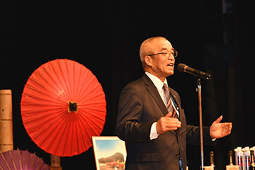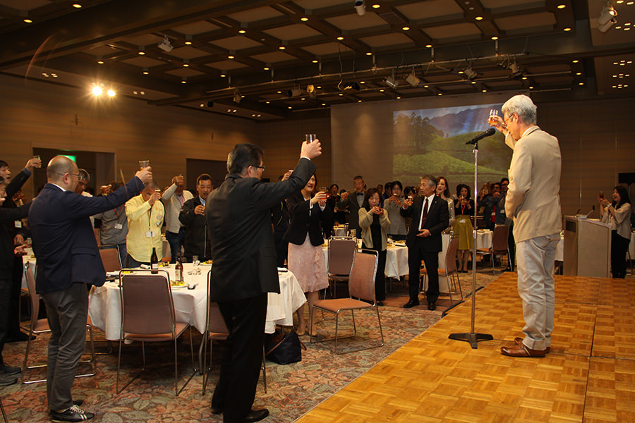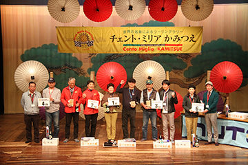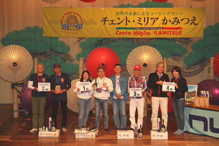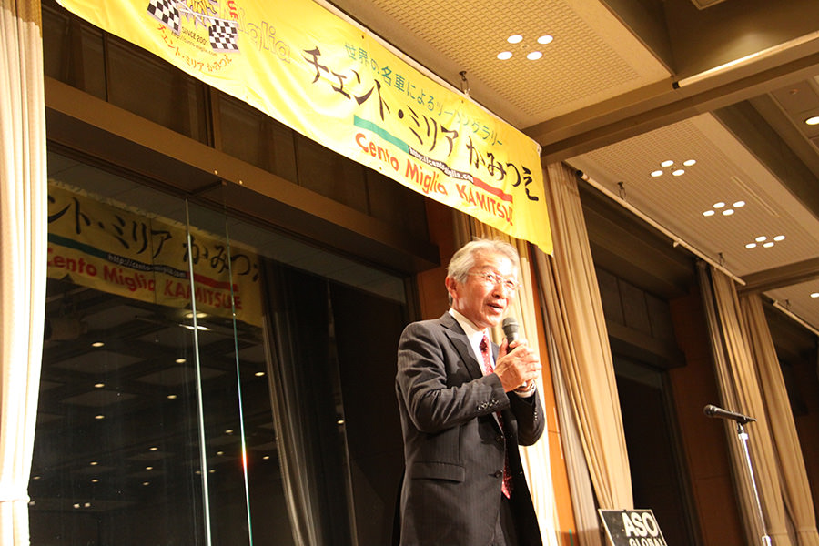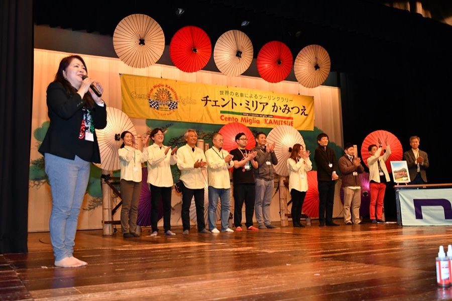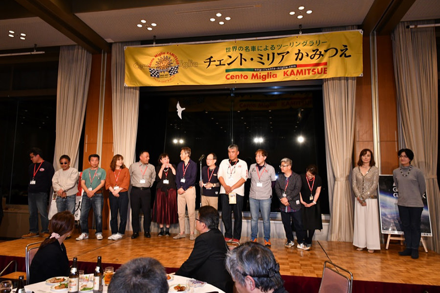 ディナーパーティーでは、様々な参加者が交流しやすいようにランダムに設定された席順で、ベテランと新規参加組がコミュニケーションを図れます(これもチェント・ミリアの特長です!)。 南阿蘇村吉良村長、阿蘇市和田副市長のご挨拶に続き、新たに参加されたエントラントの方々が壇上にのぼり自己紹介。そして、各テーブルでは美味しい料理を楽しみながら、お互いの初日のエピソードを語り合いました。常連にとっては、チェント・ミリアが1年ぶりの報告会の場でもあります。 昨年のパーティーにも参加いただいた、女優・歌手の夏樹陽子さん、なんと今年は初日のツーリングラリーにもご参加いただいておりました。平成28年熊本地震以降、チャリティ活動も行っており、この場で歌まで披露してくださいました!CDの販売もされ、その全額を南阿蘇村に寄付というスペシャルプレゼント。 あっという間に楽しい時間は過ぎ、パーティーを終えた参加者の皆さんは再び温泉に浸かり、初日の疲れを癒やしました。さて、最終日はどんなドラマが待っているのでしょうか。