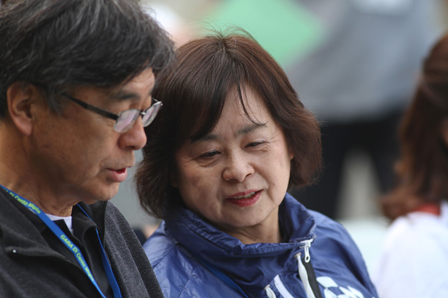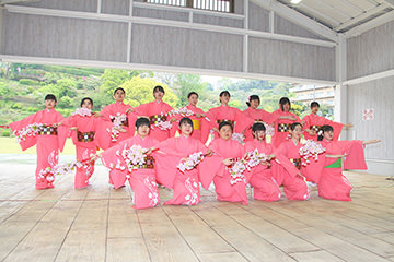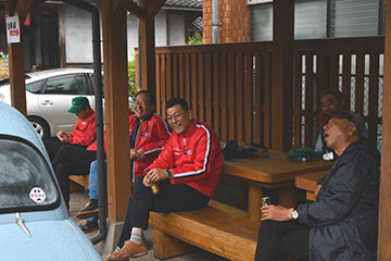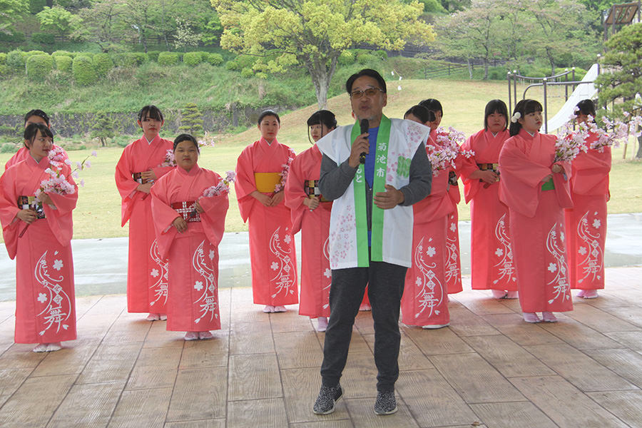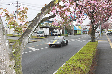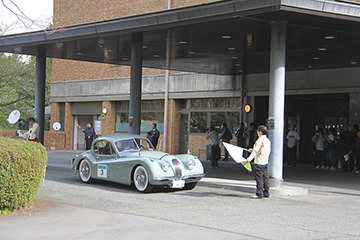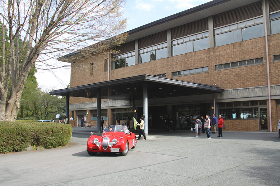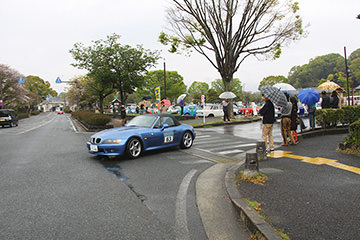 菊池市民広場では、雨の中、多くのお客様が世界の名車たちを待ちわびていました。参加者には昼食が用意されており、地元の食材をふんだんに使用した特製ランチを楽しみました。ホテルのパーティー含め、美味しい食事を楽しみにしているエントラントの方も多いのでは?と思います。朝鮮飴やゆべしのデザートまで用意していただき、もの凄い満足度でした。満腹になったあと、菊池市江頭市長より歓迎のあいさつがあり、菊池女子高等学校の生徒さんによる「きくち女子舞」も披露していただきました。ピンクの衣装と相まって優雅で見事な舞でした。ここが最後のスタンプポイントとなり、いよいよ最終ゴールへと向かいます。