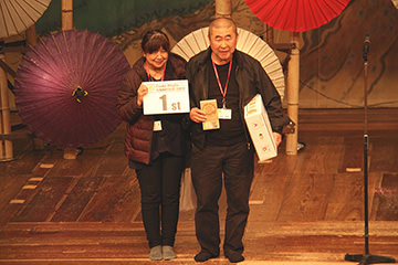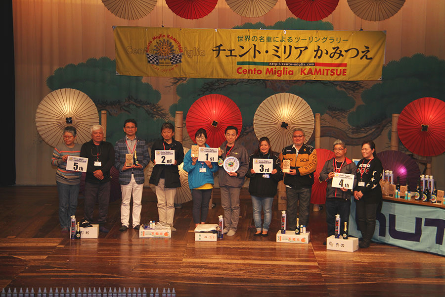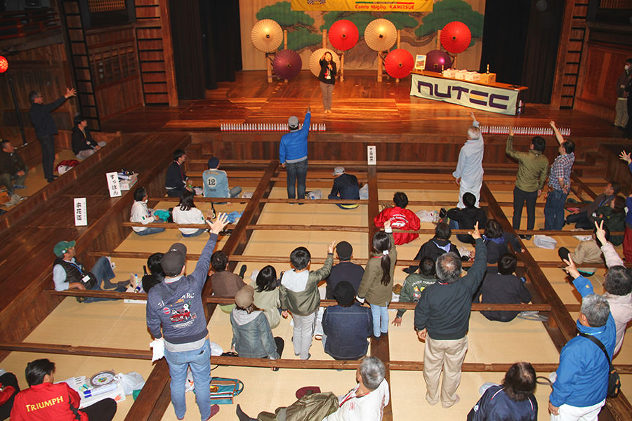 2日間でおよそ330kmを走破し、やりきった表情のエントラントたち(?)歴史ある芝居小屋「八千代座」の中で最後の表彰式が始まります。山鹿市中嶋市長、山鹿温泉観光協会高野会長のご挨拶を賜り、各表彰がはじまると上位入賞者には日田杉特製トロフィーや豪華賞品・景品の贈呈があり、大会スポンサーであるオイルメーカー“NUTEC”様より参加者全員にプレゼントが渡されました。