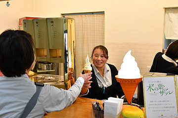 豆田町から次なるスタンプポイントへ。コースは南東方面に設定されていました。“スカイファームロードひた”を経由して、到着したのは、九重の雄大な山々を背にした長者原の「レストハウスやまなみ」。こちらで参加者は大自然の中での美味しい空気と参加受付で配られた引換券と引き換えに絶品ソフトクリームを受け取り、舌鼓を打ちました。