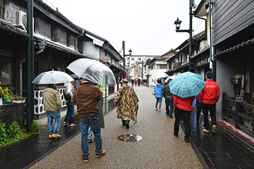最終ゴール地は、山鹿市の「千代の園酒造」「光専寺」特設会場。江戸時代に菊池米の産地として、また米相場を決める集散地として、大阪へ運ばれるお米の流通の拠点として栄えた惣門エリアの歴史を学ぶ「米米惣門ツアー」を体験できました。ツアー体験後、豊前街道の古い街並みを眺めながら、のんびり八千代座まで歩きました。