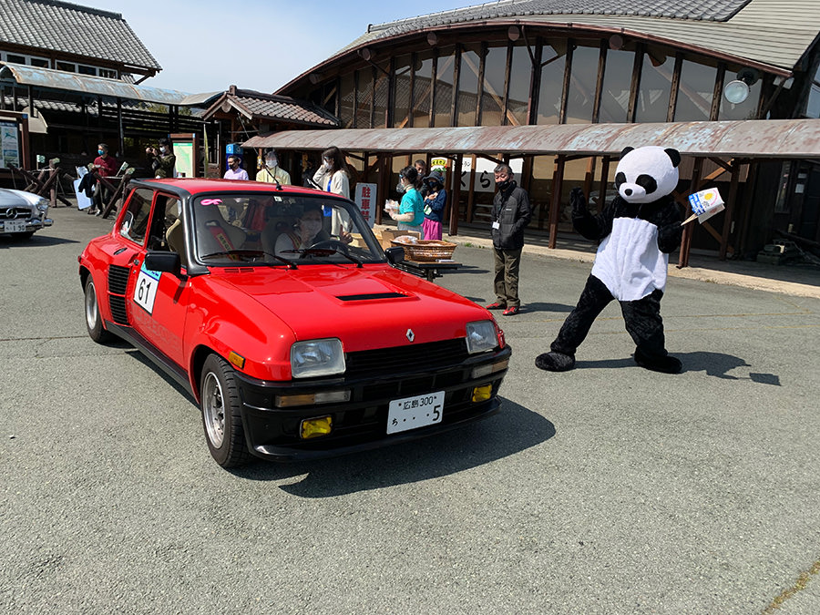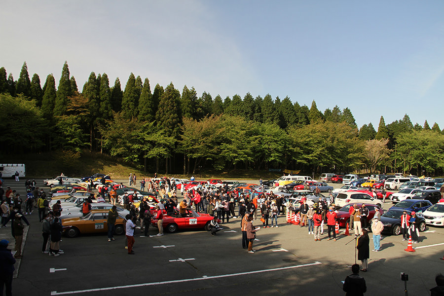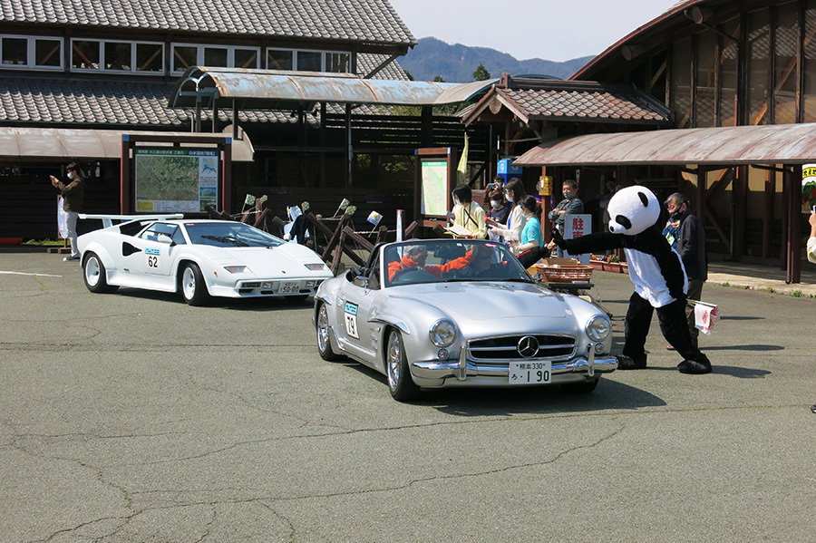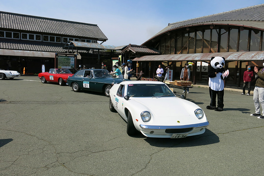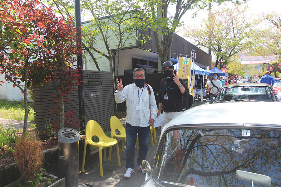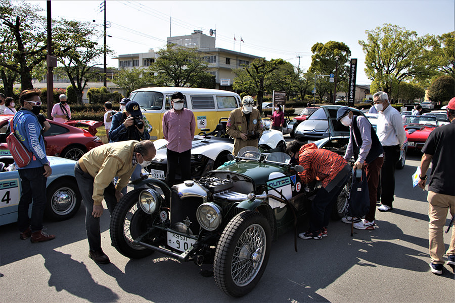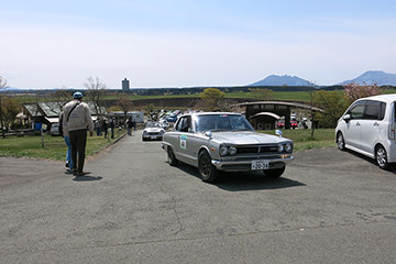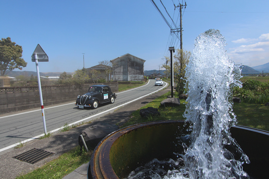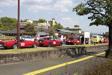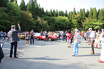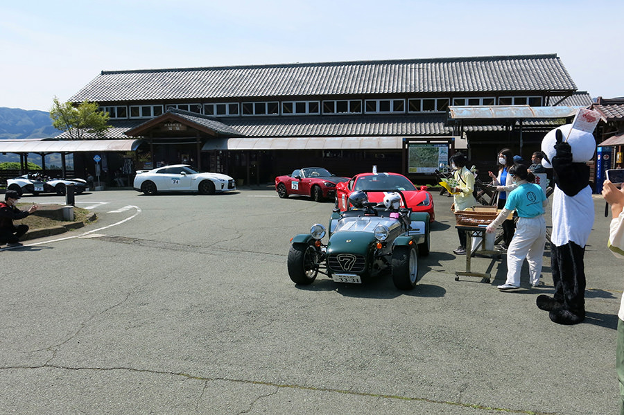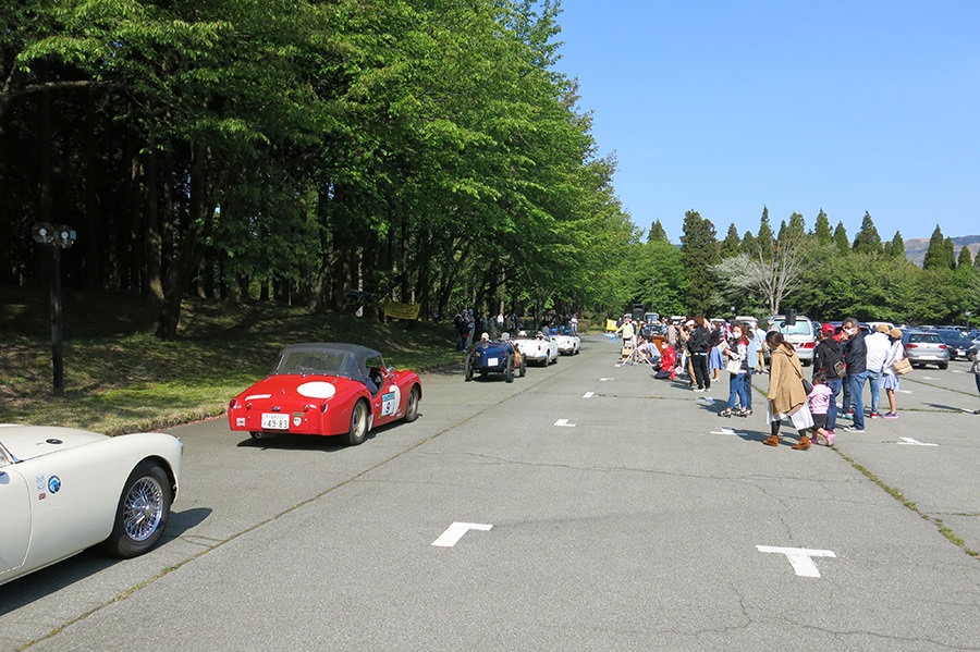 華々しくも儚い、菊池一族の栄枯盛衰を代表する武光公騎馬像の勇壮な姿と、今は温かく訪れる人を迎える足湯や物産館が、時の隔たりを教えてくれます。700年もの長い年月ののちに、遠い国で生まれた現代の馬車が足元に集まろうとは思いもよらなかったことでしょう。それぞれの時代をリードしたノスタルジックなクルマが集まっては走り去る、おなじみの光景が展開され、今年もたくさんの笑顔と声援に包まれました。 エントラントは、事前配布されたショッピングチケットを使用し物産館でお土産を購入、菊池米や銘菓のプレゼントをいただきました。地域の皆様のご協力を得て、スムーズな進行が出来ましたことを感謝申し上げます。