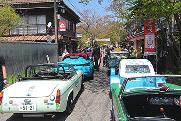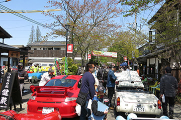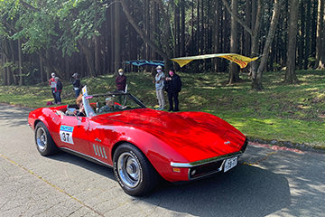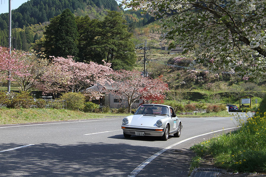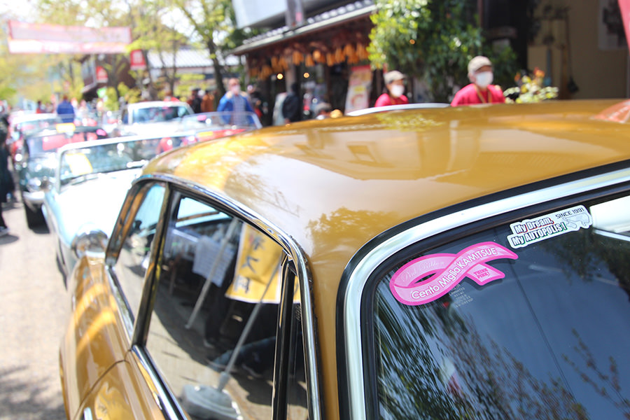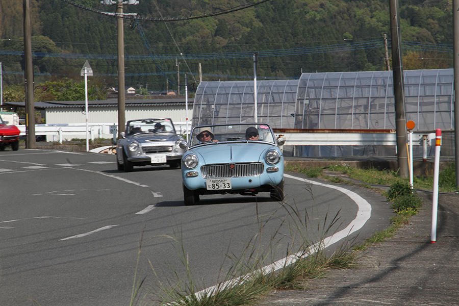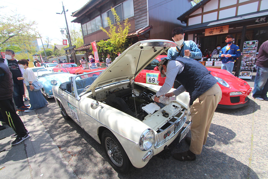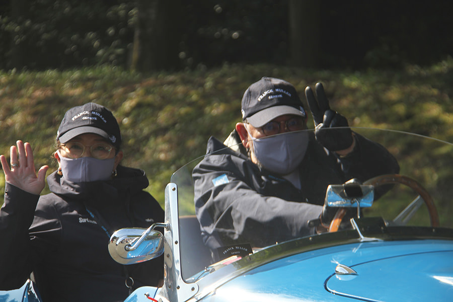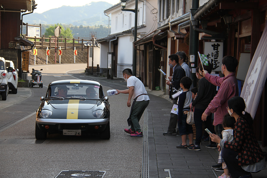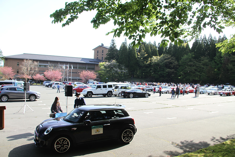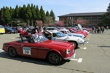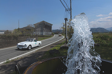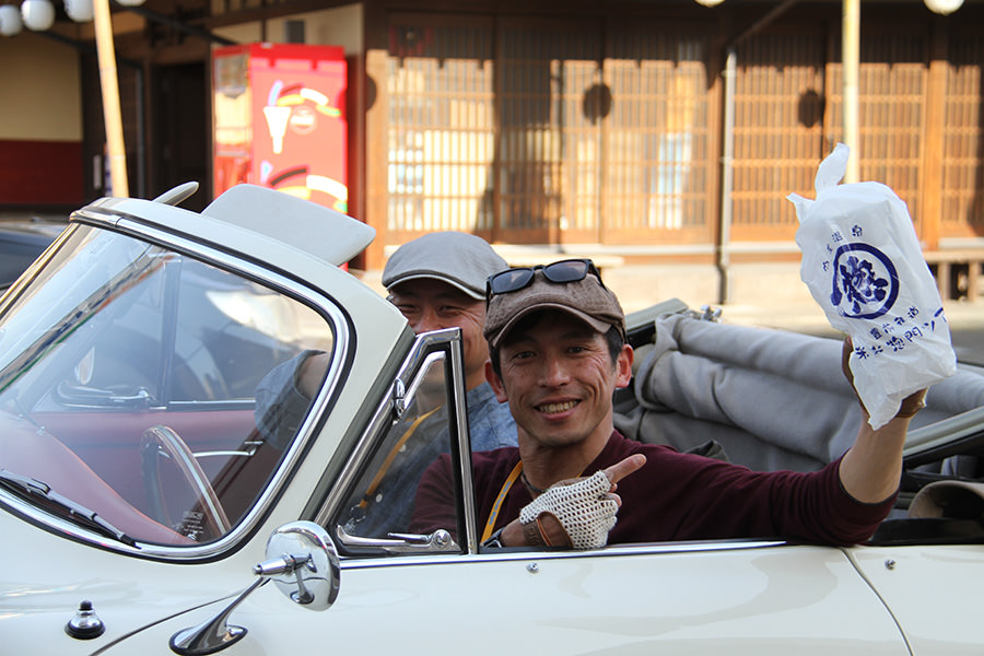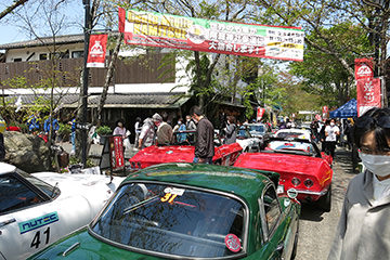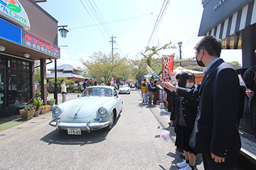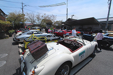 華々しくも儚い、菊池一族の栄枯盛衰を代表する武光公騎馬像の勇壮な姿と、今は温かく訪れる人を迎える足湯や物産館が、時の隔たりを教えてくれます。700年もの長い年月ののちに、遠い国で生まれた現代の馬車が足元に集まろうとは思いもよらなかったことでしょう。それぞれの時代をリードしたノスタルジックなクルマが集まっては走り去る、おなじみの光景が展開され、今年もたくさんの笑顔と声援に包まれました。 エントラントは、事前配布されたショッピングチケットを使用し物産館でお土産を購入、菊池米や銘菓のプレゼントをいただきました。地域の皆様のご協力を得て、スムーズな進行が出来ましたことを感謝申し上げます。