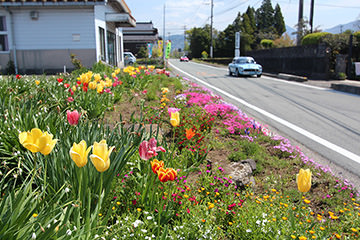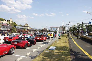 阿蘇白水温泉“瑠璃”は、南阿蘇村の憩いの場となっており、村民と来訪者との交流の場でもあります。そこに80台の名車たちが集うと、利用客の皆さんがくぎづけとなり笑顔で見学をしていました。地元の皆様とパンダにふんした長陽駅の駅長がお出迎えしてくれました。見学の子供が参加車両と記念撮影をし、嬉しそうにはしゃいでいました。