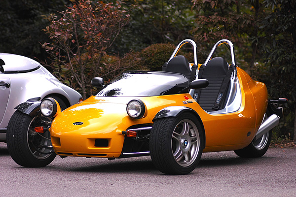 | 英国生まれの三輪車です。BMWの4気筒エンジンを後ろに載せ、前2輪、後ろ1輪の「サソリ」の様な姿です。 | ||||||