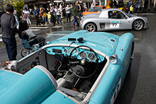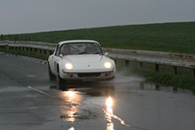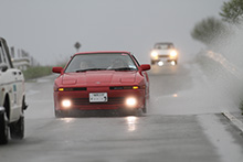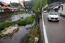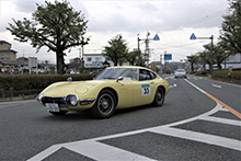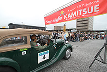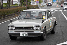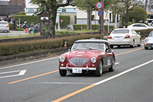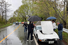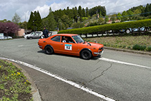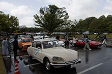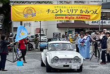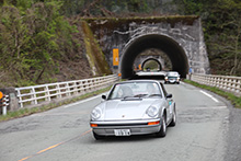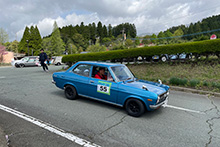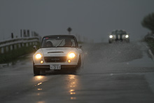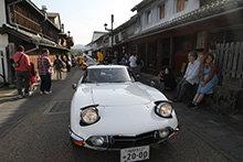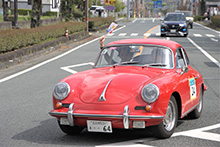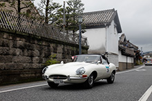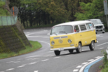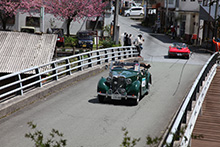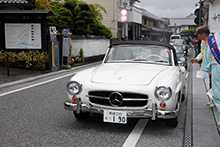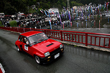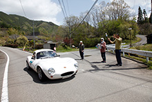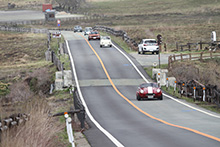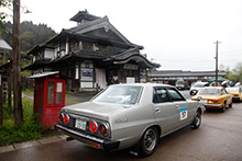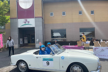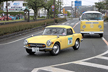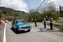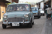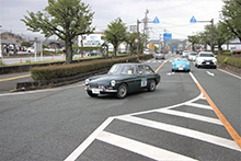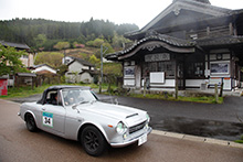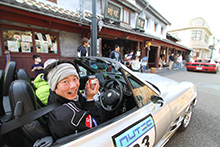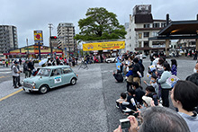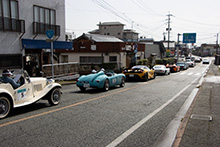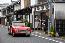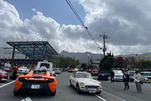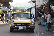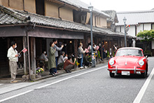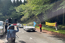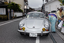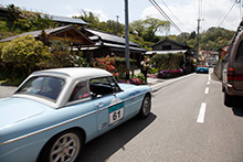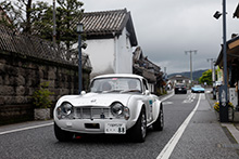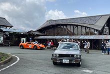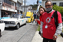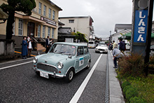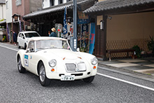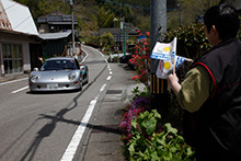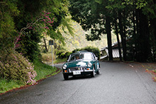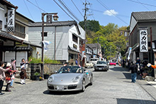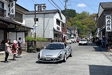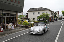久住山系東の麓にある直入町に長湯温泉はあります。街のシンボルである“ガニ湯”の前がスタンプポイントです。参加者が到着する頃は小雨の降る中でしたが、地域の方々にもお手伝いいただき、温泉街を世界の名車が駆け抜けました。