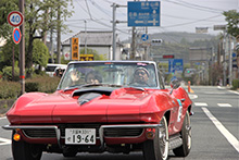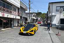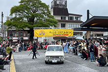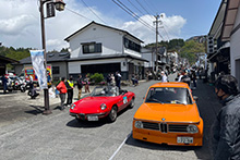 2日目のランチタイムは町をあげての歓迎でおなじみ馬見原商店街。石畳に100台近い名車が並び、いつもは静かな店先がパドックのような賑やかさになりました。交流広場での歓迎セレモニー等、町と地域の方々のご協力と応援の熱気が参加者と我々スタッフまで元気にしてくれました。