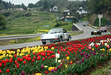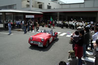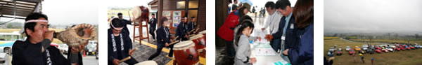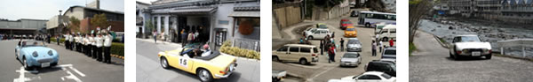 小雨が降り始めた“あそ望の郷くぎの”では、希少なクルマを見ようと多くの見学者がチームを待ちわびていました。全車の到着を待って、“阿蘇久木野太鼓”の歓迎セレモニーが始まります。阿蘇山の雄姿は雲に隠れていましたが、心に響く迫力のある演奏に参加者や見学者も感激の様子でした。 その後、ランチを取った参加者達は、見学の方々の見送りを受け1台1台後半のステージへ向けラストスパートです。